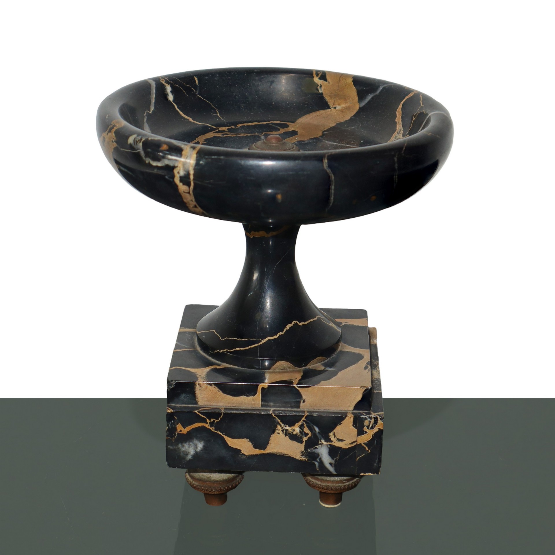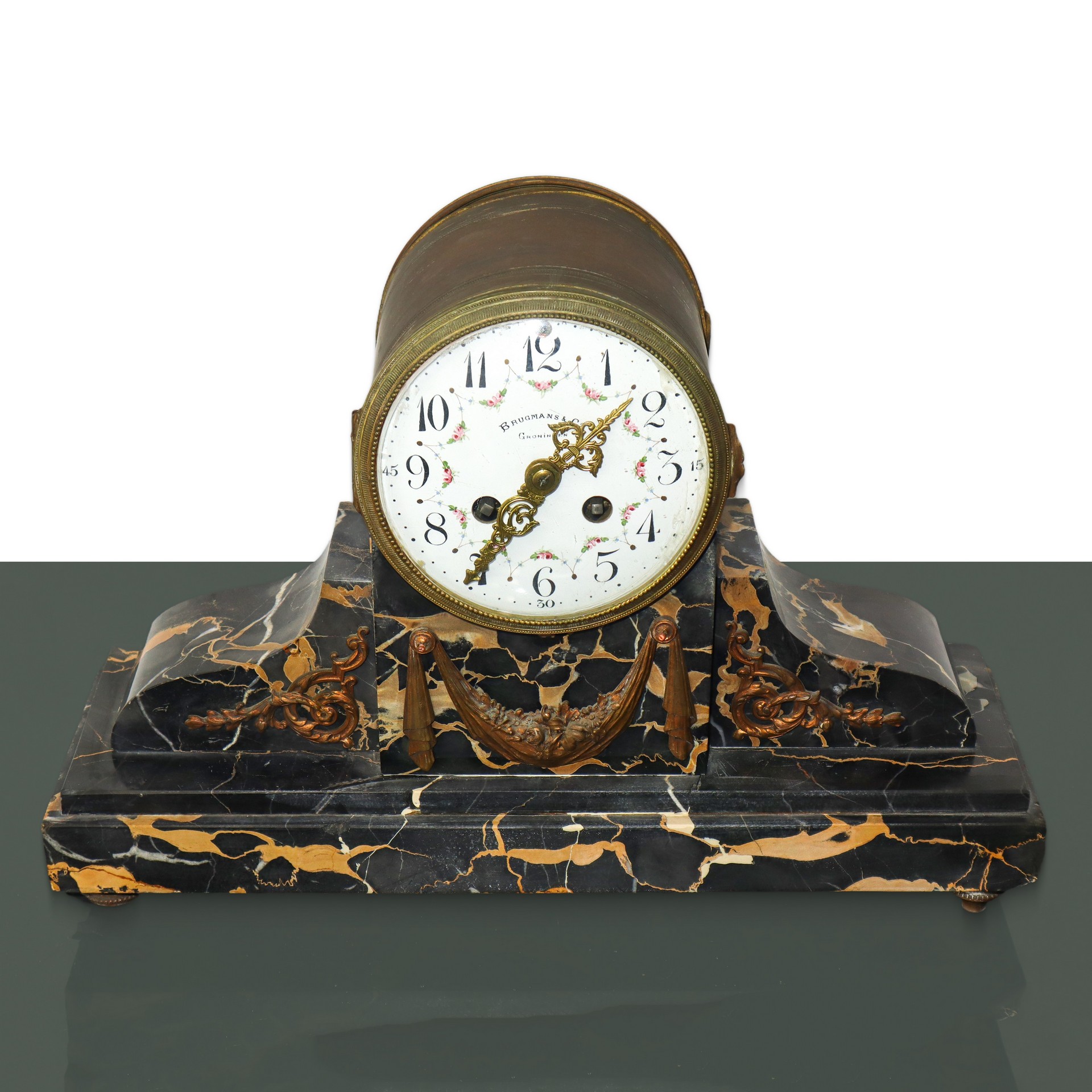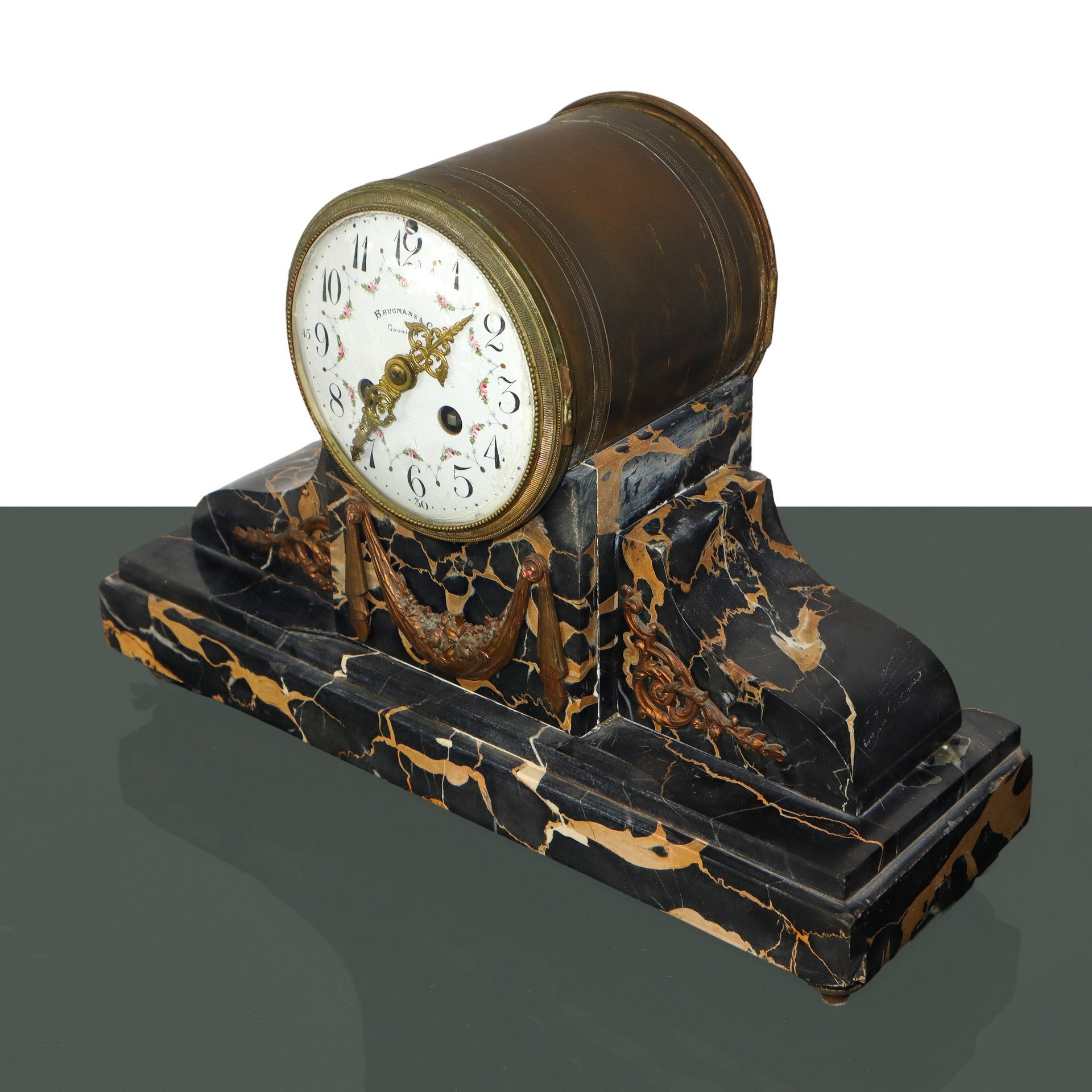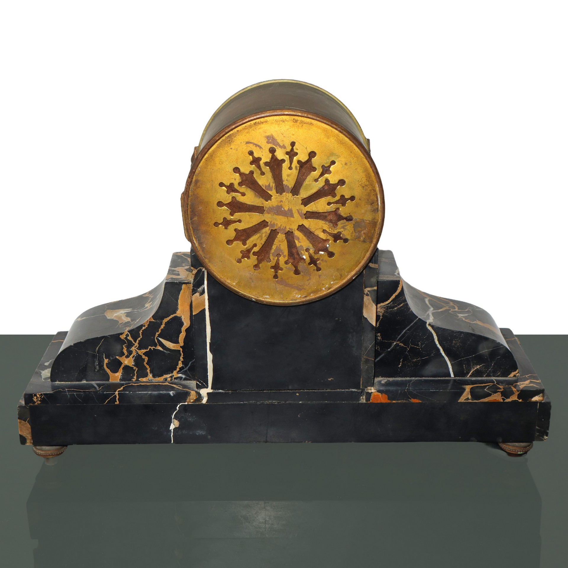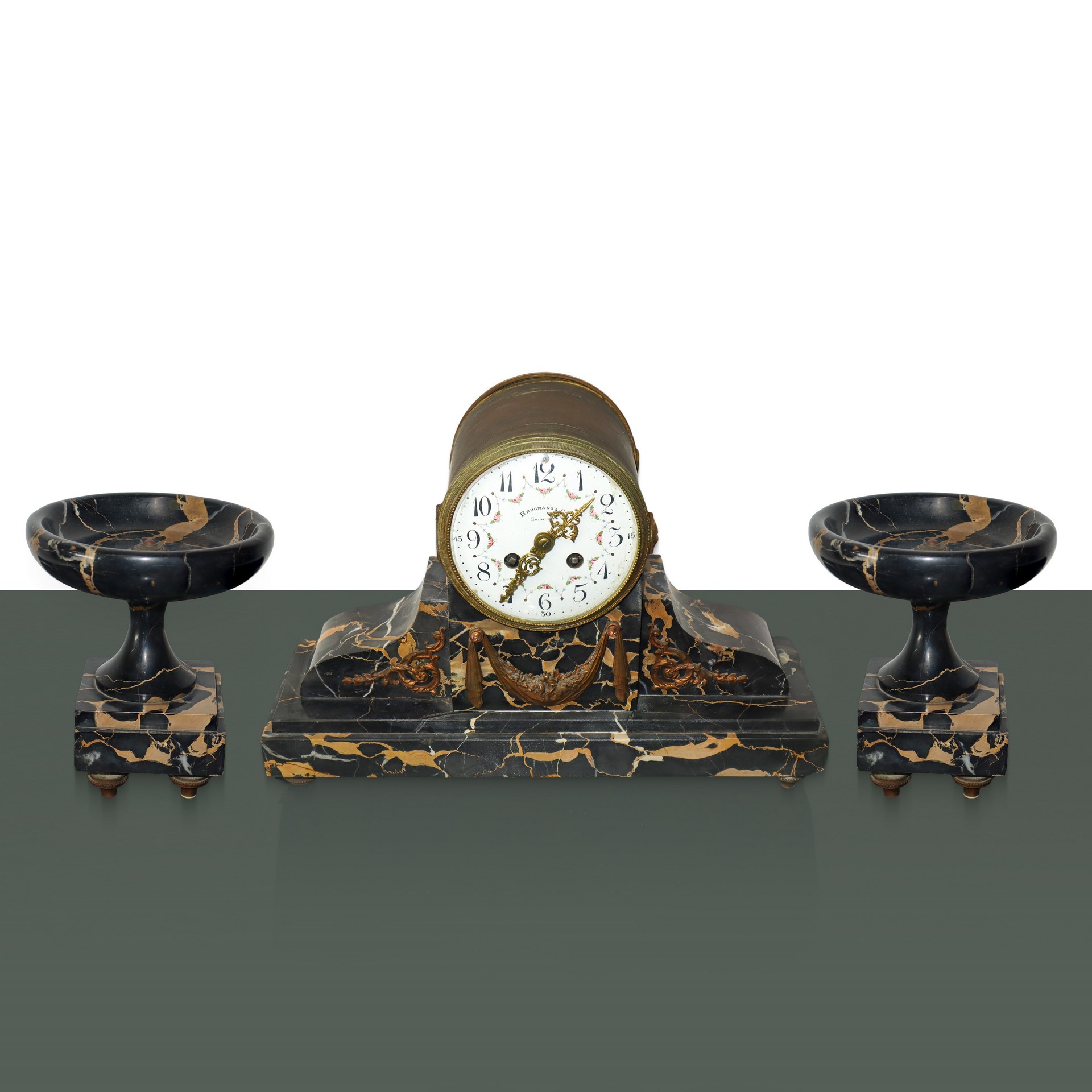 Trittico composto da orologio da tavolo e coppia di alzate in marmo portoro, 19° secolo