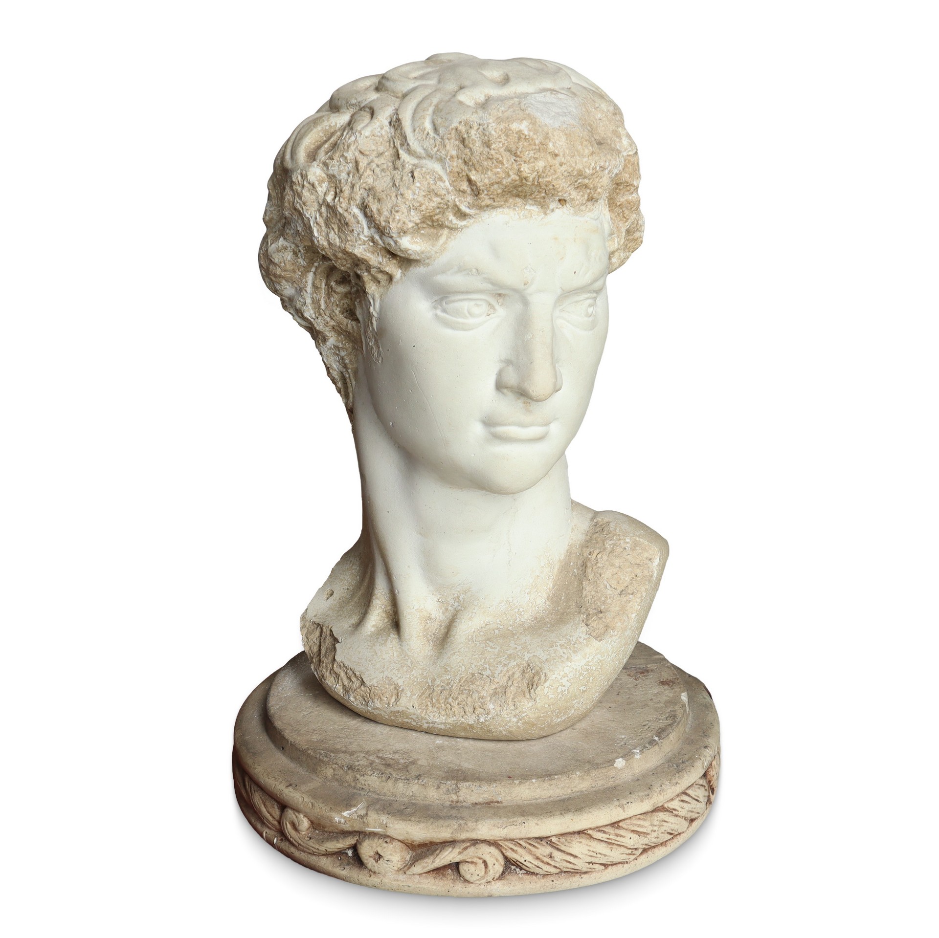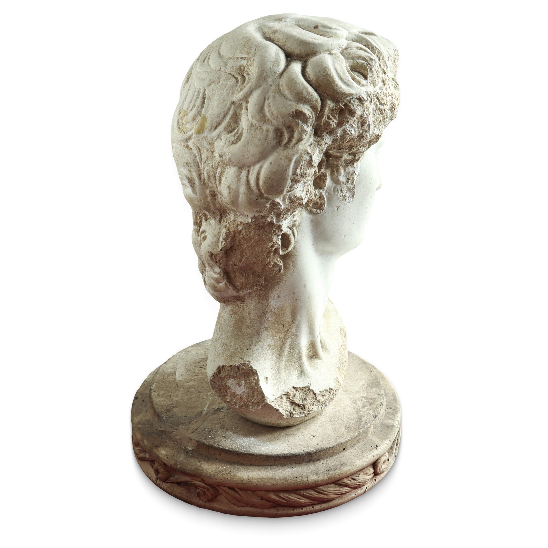 Testa di giovane romano in pietra ricostituita con base rotonda, 20° secolo