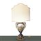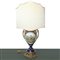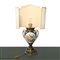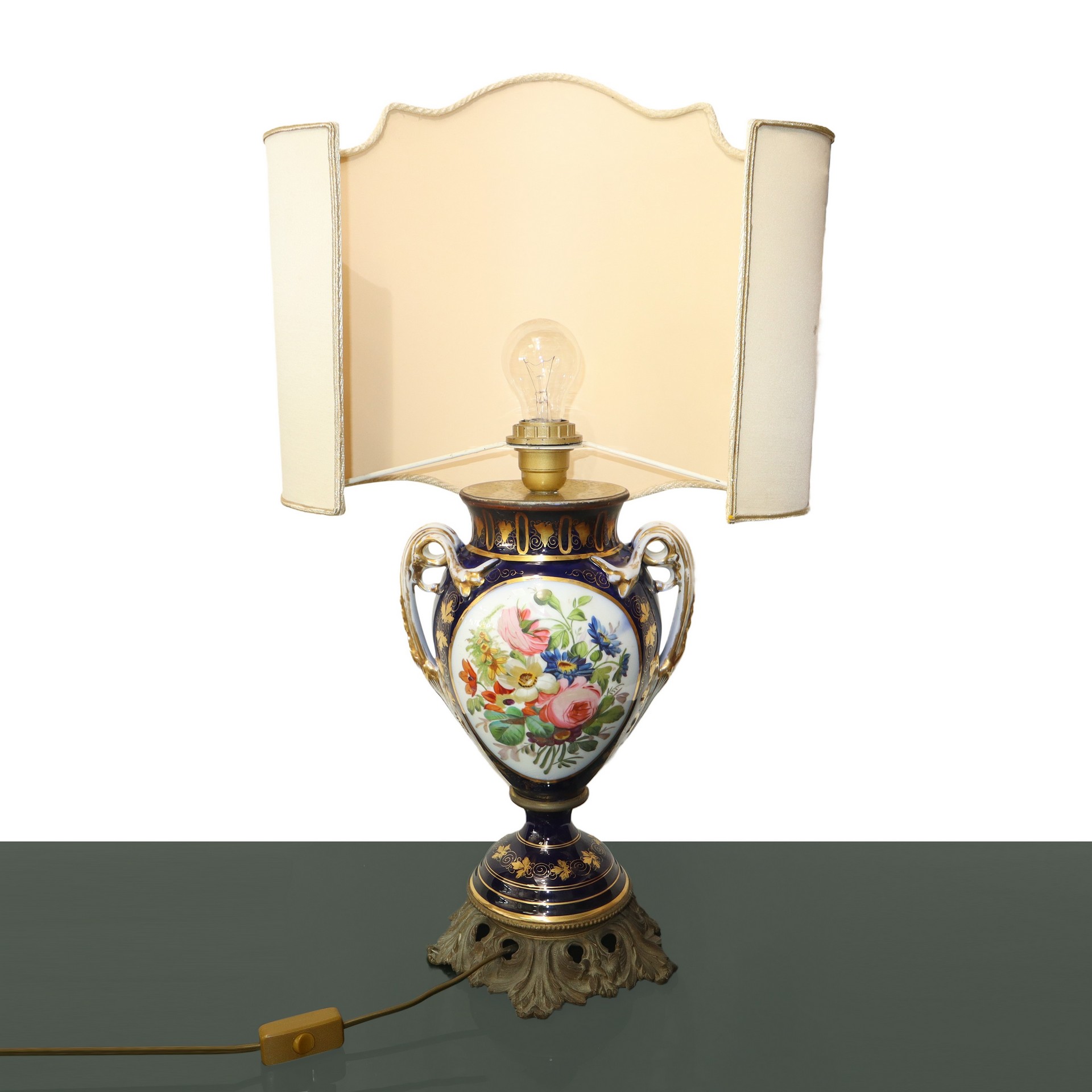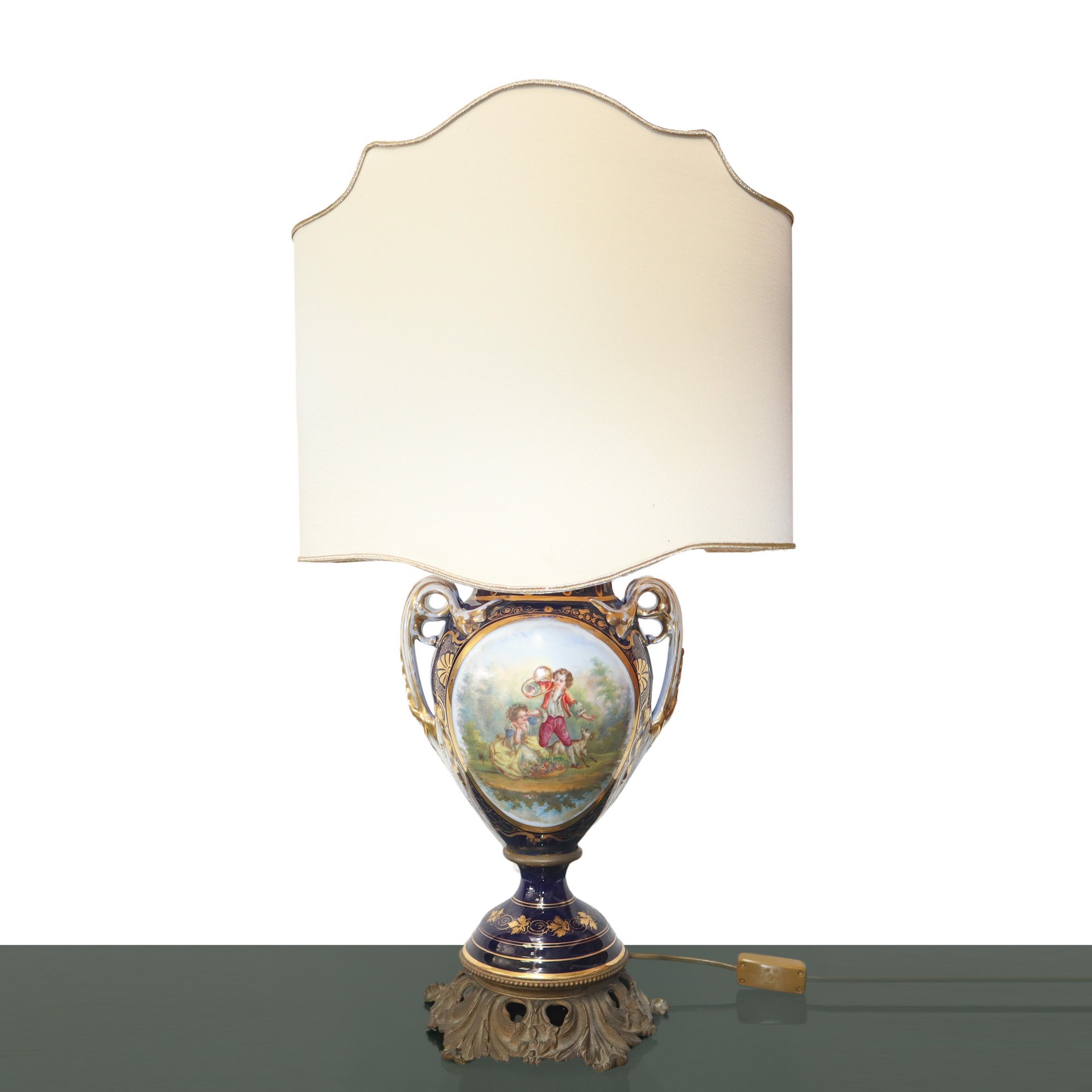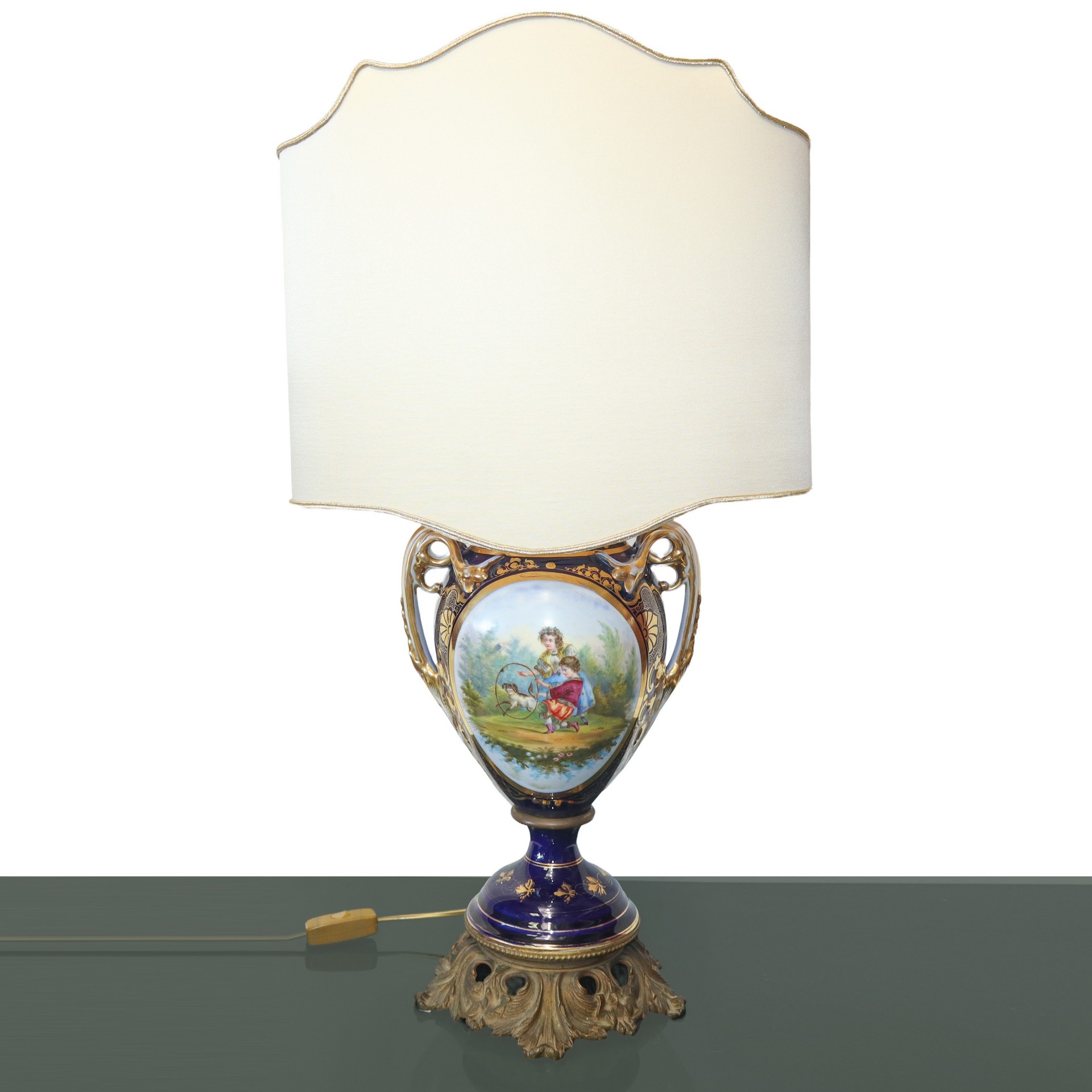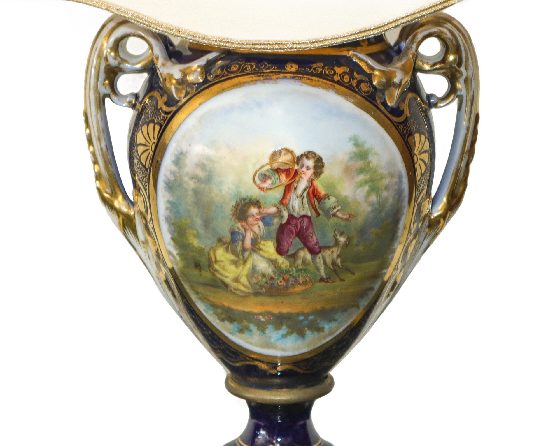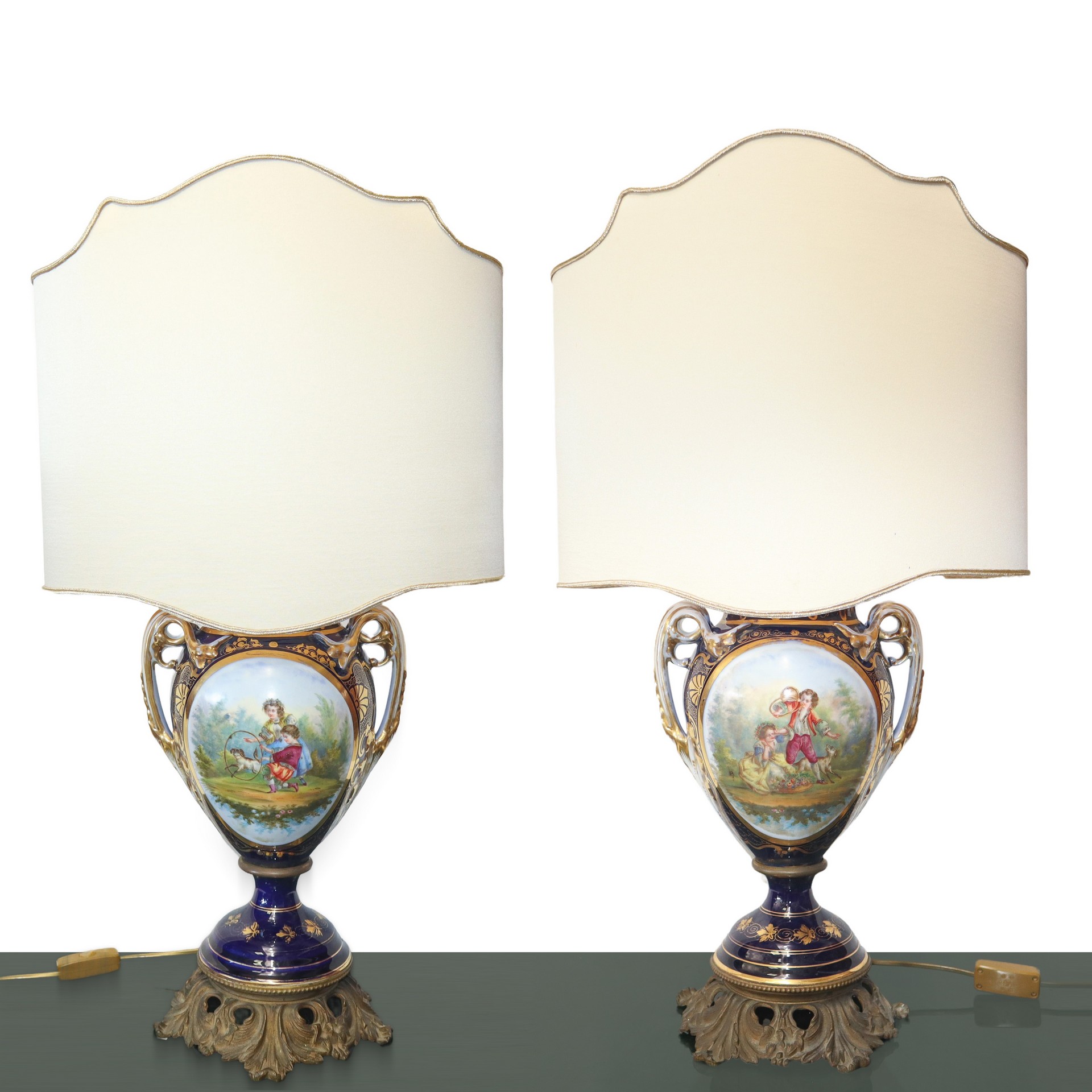 Coppia di lumi con vasi dipinti con scene di genere e motivi floreali in porcellana blu stile Sevres