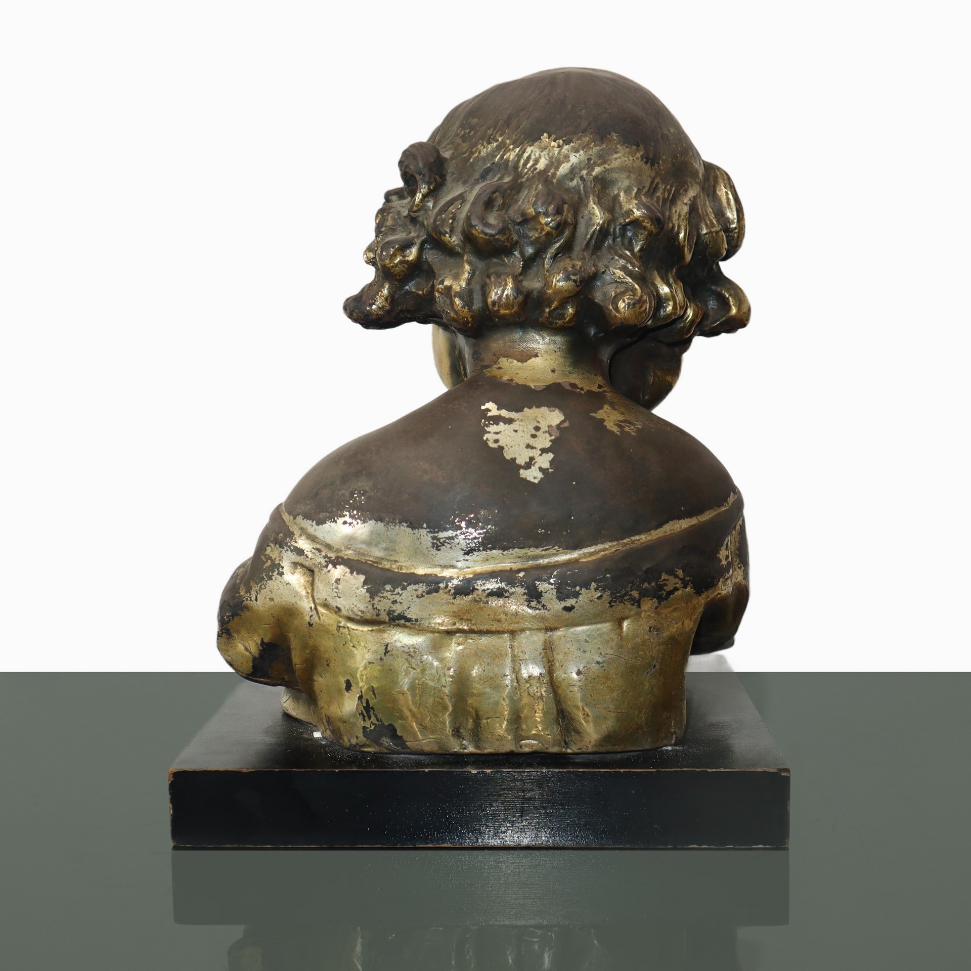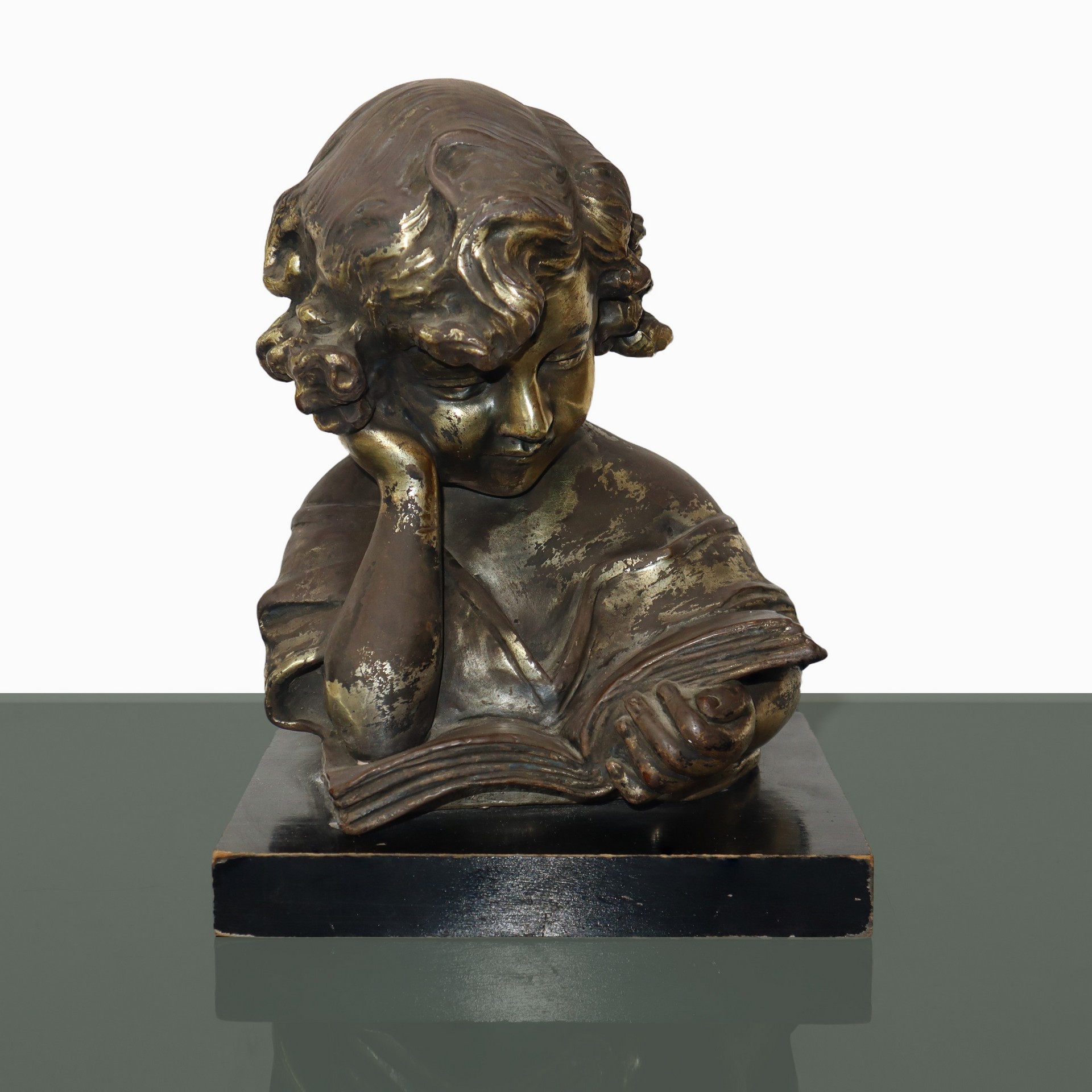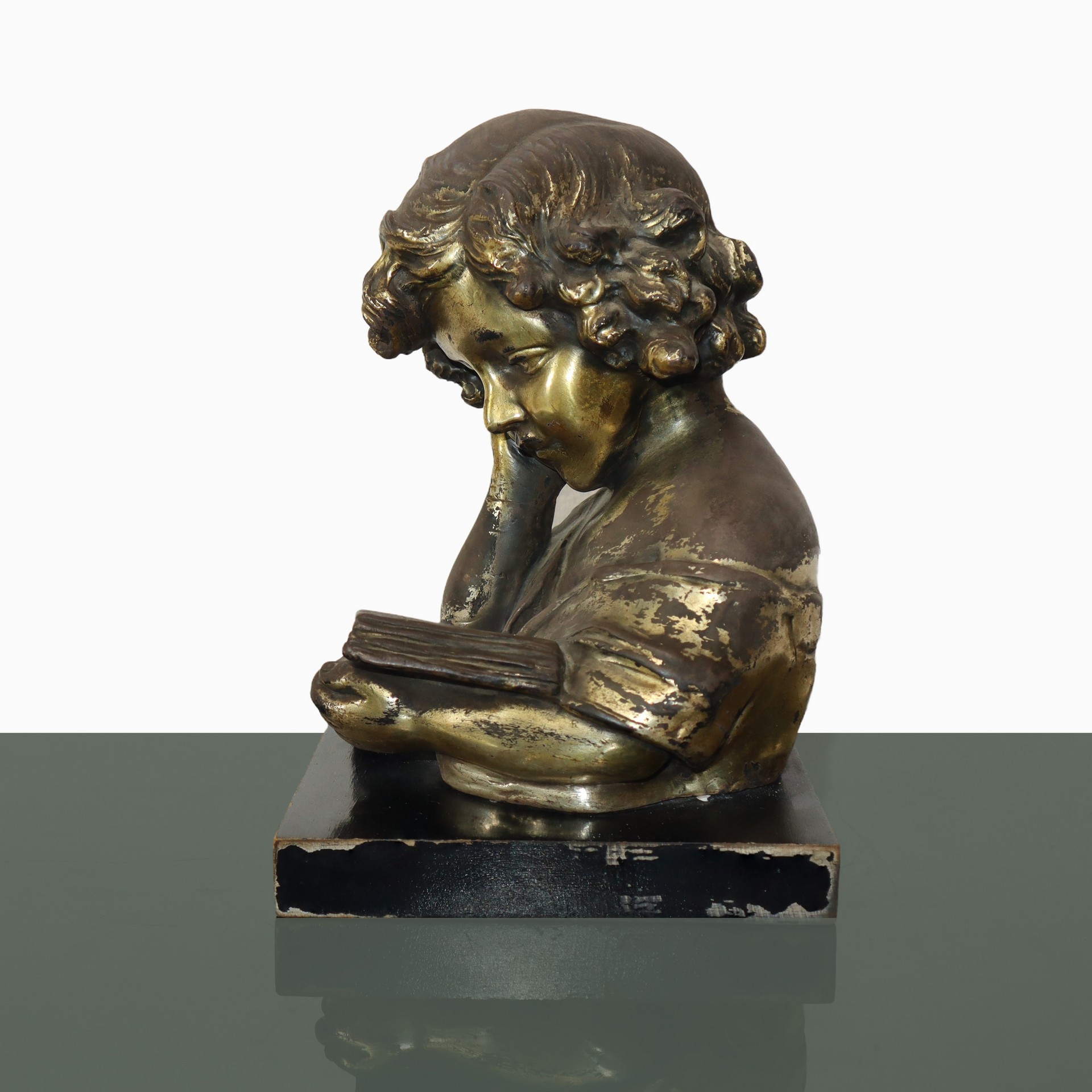 Fanciulla che legge un libro in terracotta patinata oro su base in legno, primi 20° secolo