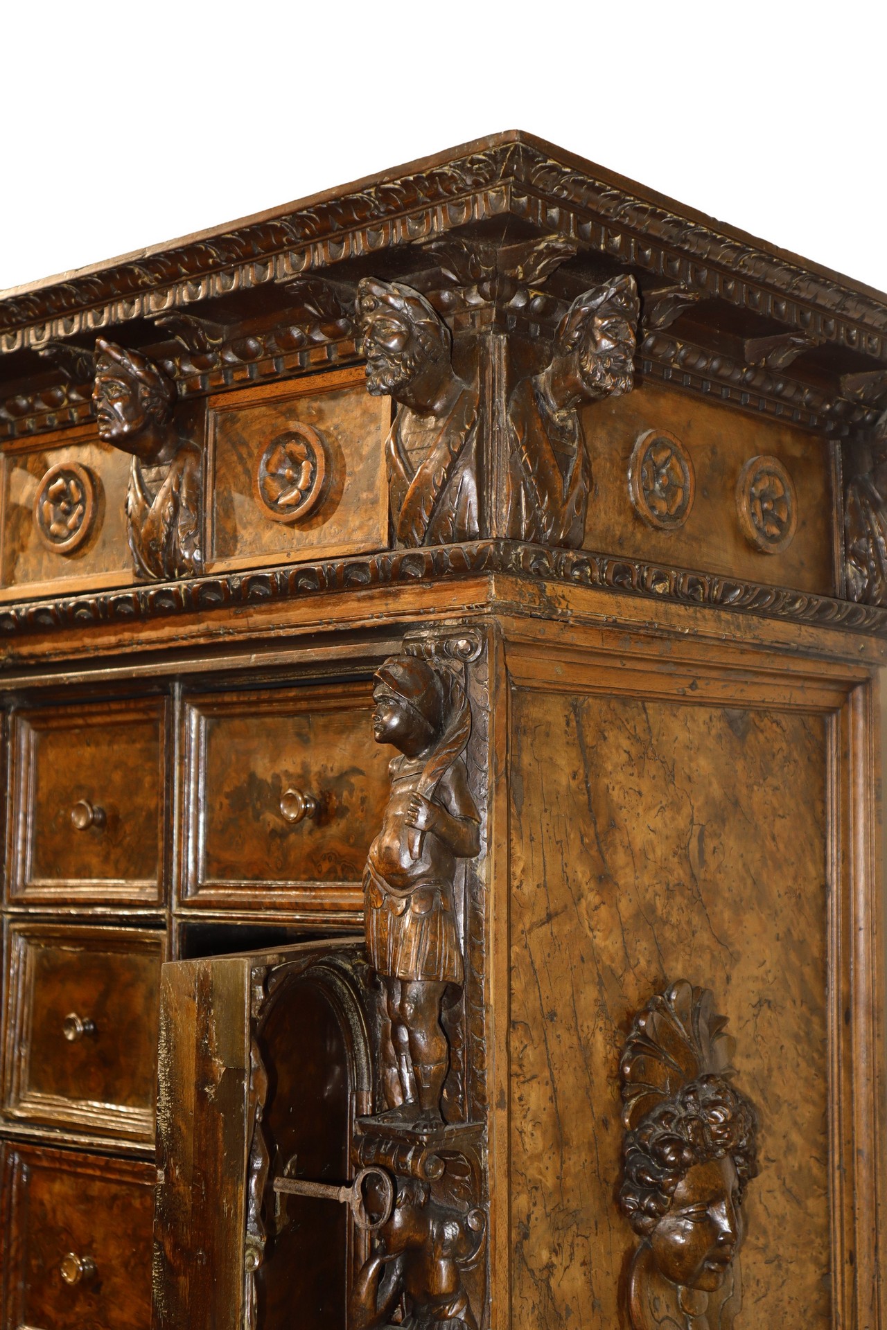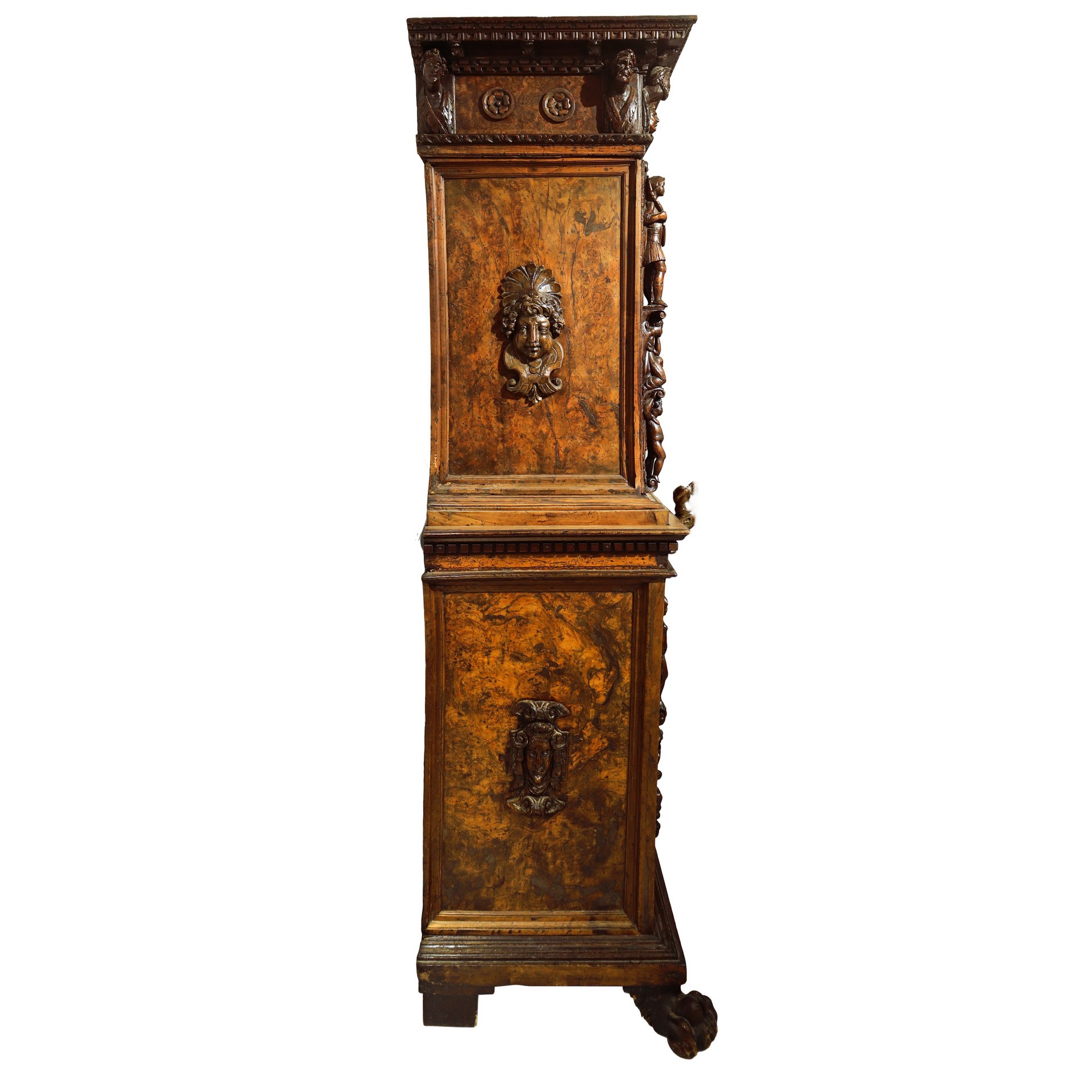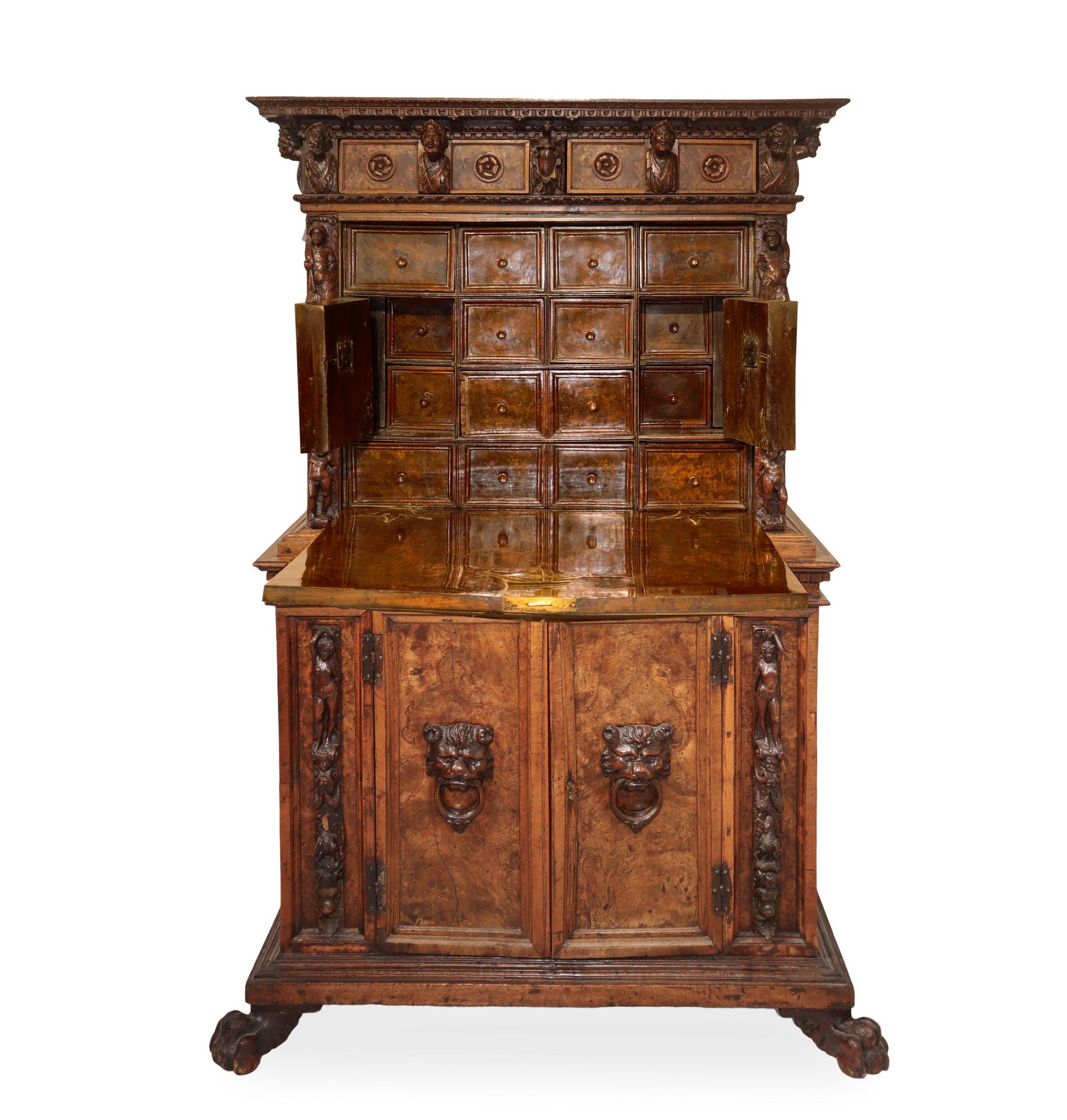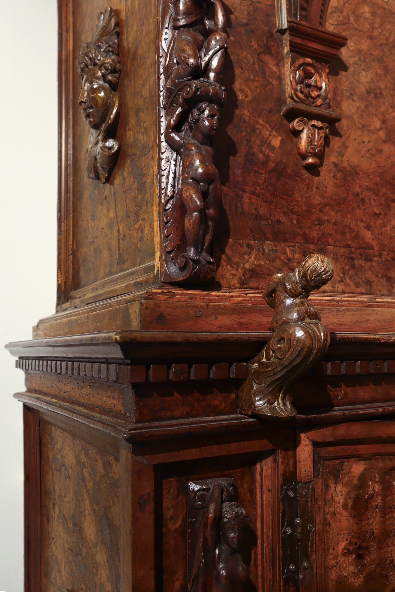 Cabinet rinascimentale a dobbio corpo in legno di radica di noce , Genoa, fine 16°/17° secolo h cm 177X123X56 Riccamente scolpito con figure a tutto tondo poste ai lati. Cappello con rosoni intercalanti tra testine decorative. Caratoia centrale in radica intagliata con motivi architettonici ad arco all'interno cassettiera con porticina ad arcoai lati. Figure di nudi poste ai lati. Corpo basso a due sportelli con maniglie a testa di leone sui lati entro cornice al centro busti muliebri. Piedi leoniniDenominiamo questo mobile a bambocci per la serie di intagli a tutto tondo di figure intere e di protomi che ornano sia frontalmente che fineralmente tutto il manufatto.