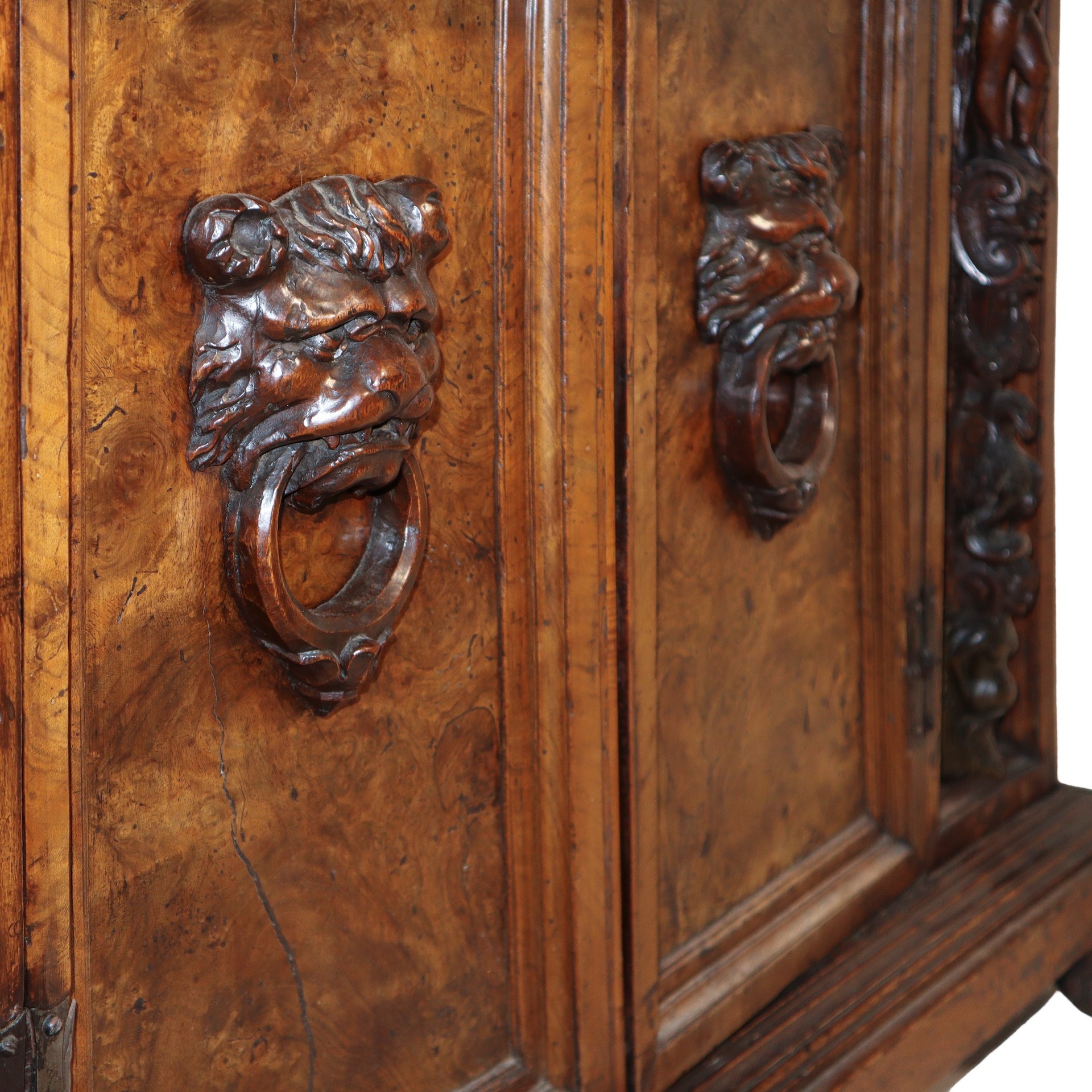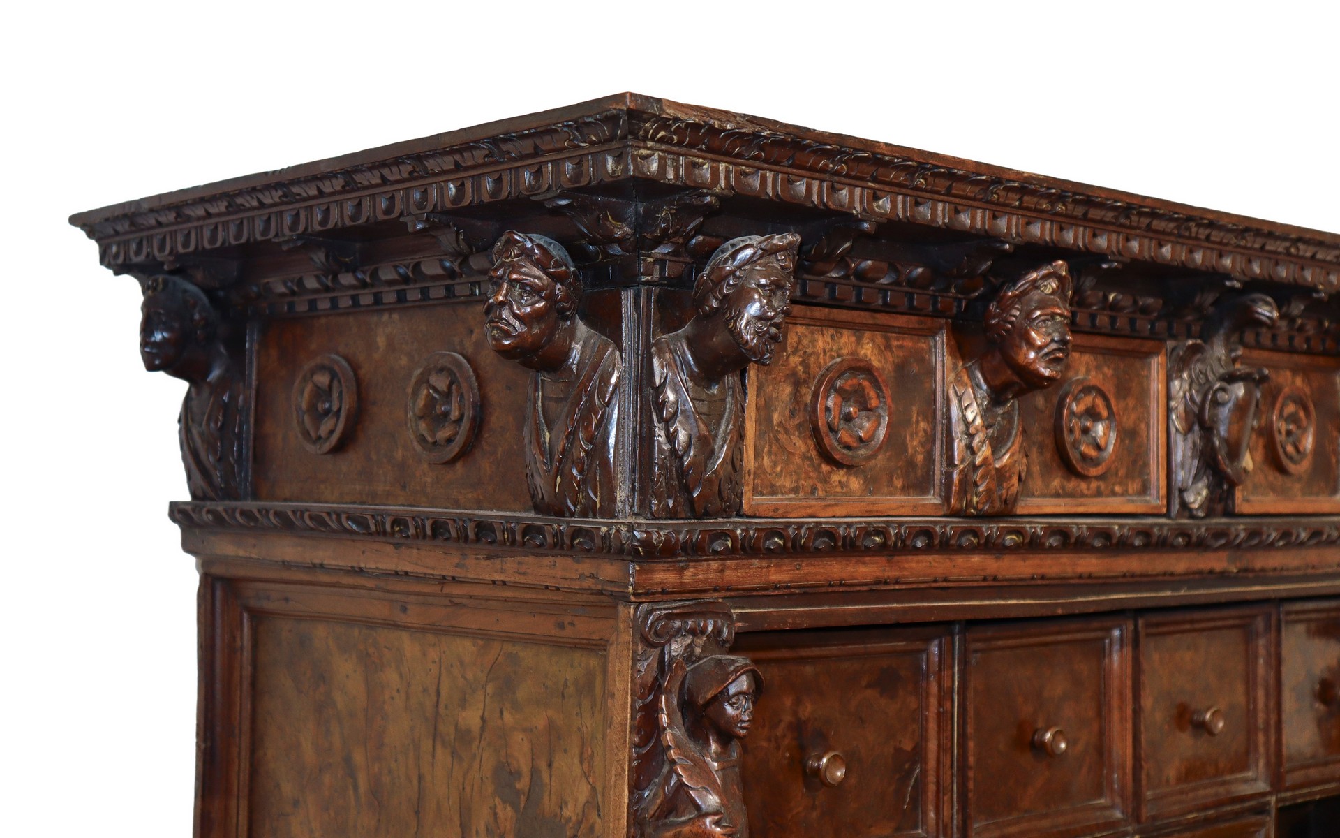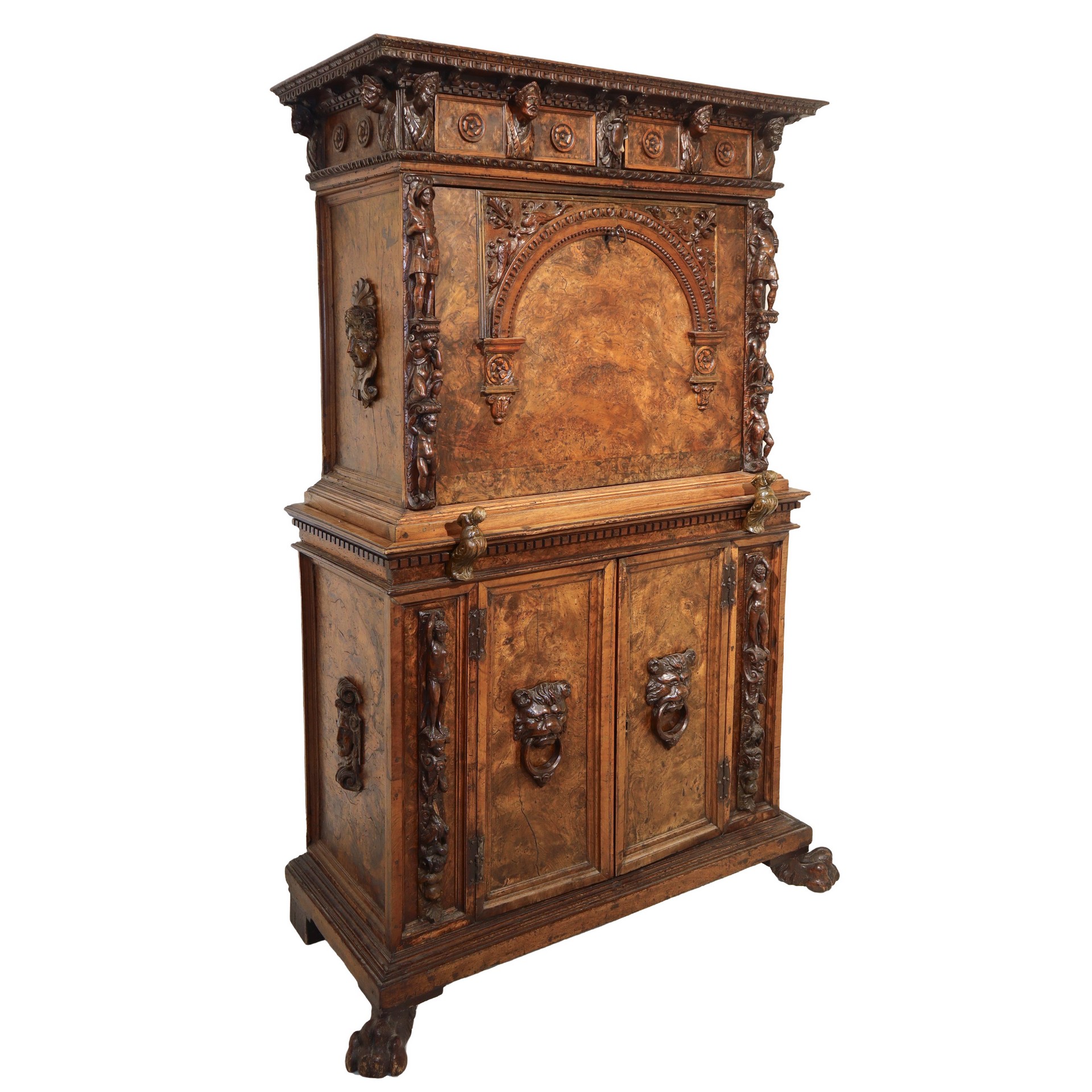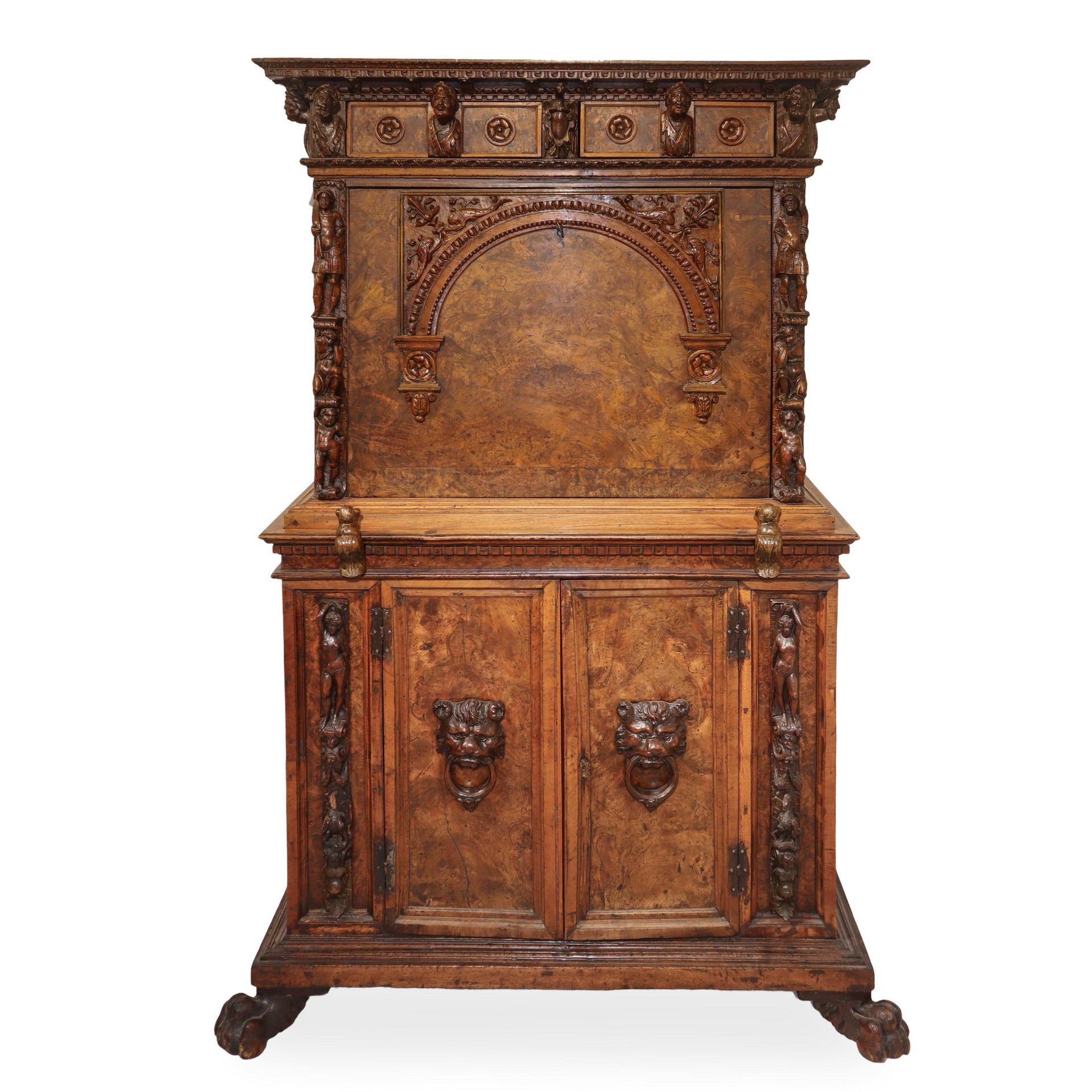 Cabinet rinascimentale a dobbio corpo in legno di radica di noce , Genoa, fine 16°/17° secolo h cm 177X123X56 Riccamente scolpito con figure a tutto tondo poste ai lati. Cappello con rosoni intercalanti tra testine decorative. Caratoia centrale in radica intagliata con motivi architettonici ad arco all'interno cassettiera con porticina ad arcoai lati. Figure di nudi poste ai lati. Corpo basso a due sportelli con maniglie a testa di leone sui lati entro cornice al centro busti muliebri. Piedi leoniniDenominiamo questo mobile a bambocci per la serie di intagli a tutto tondo di figure intere e di protomi che ornano sia frontalmente che fineralmente tutto il manufatto.