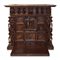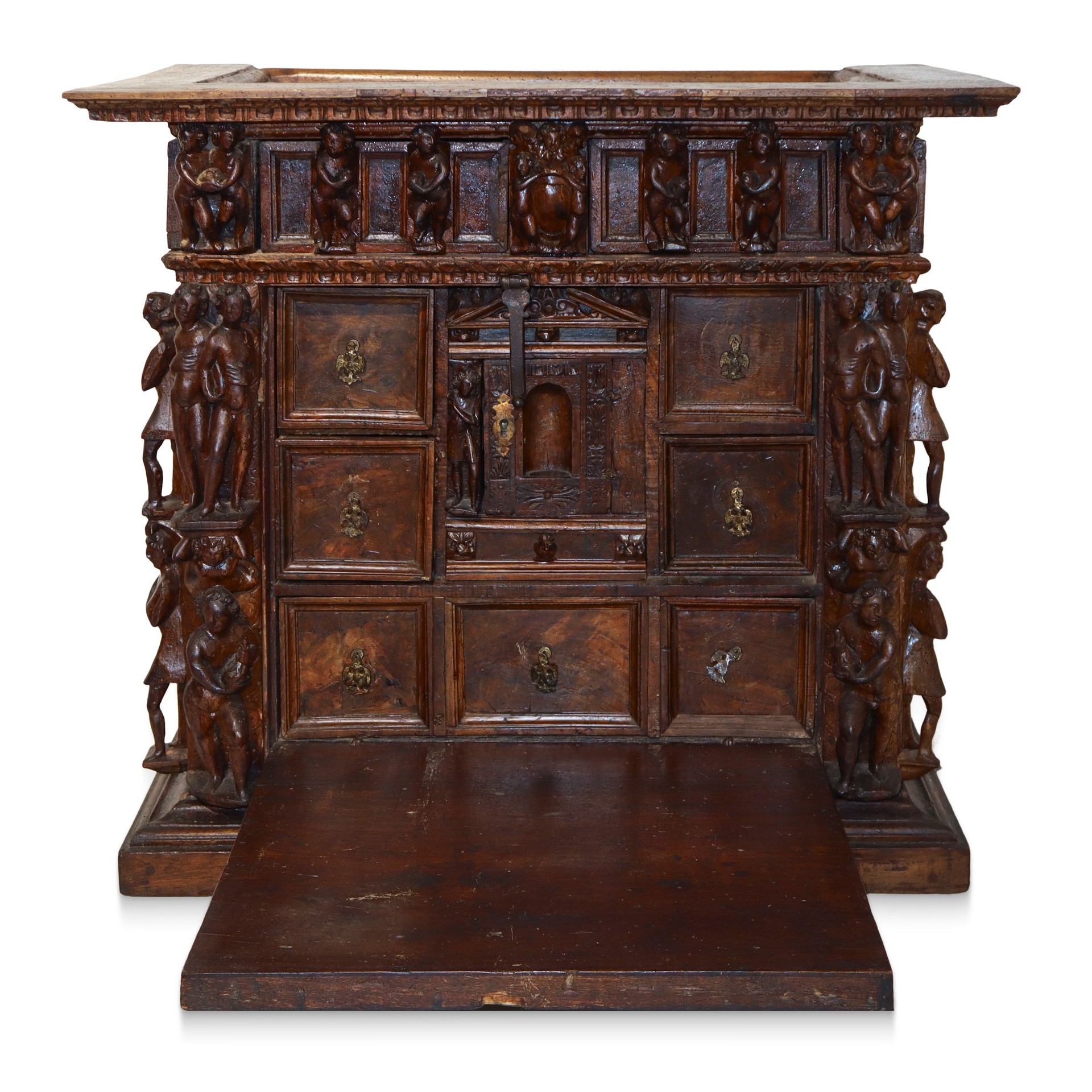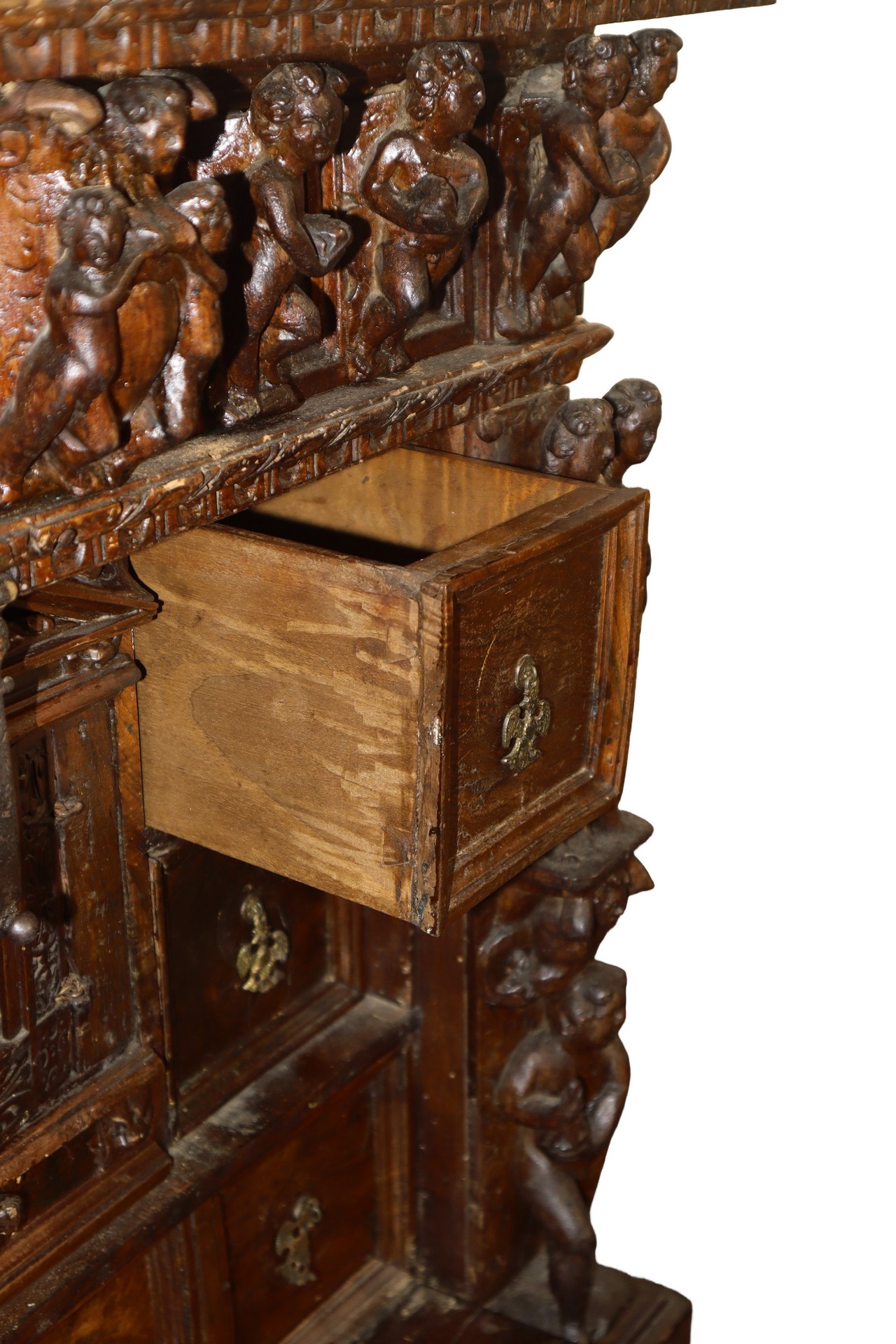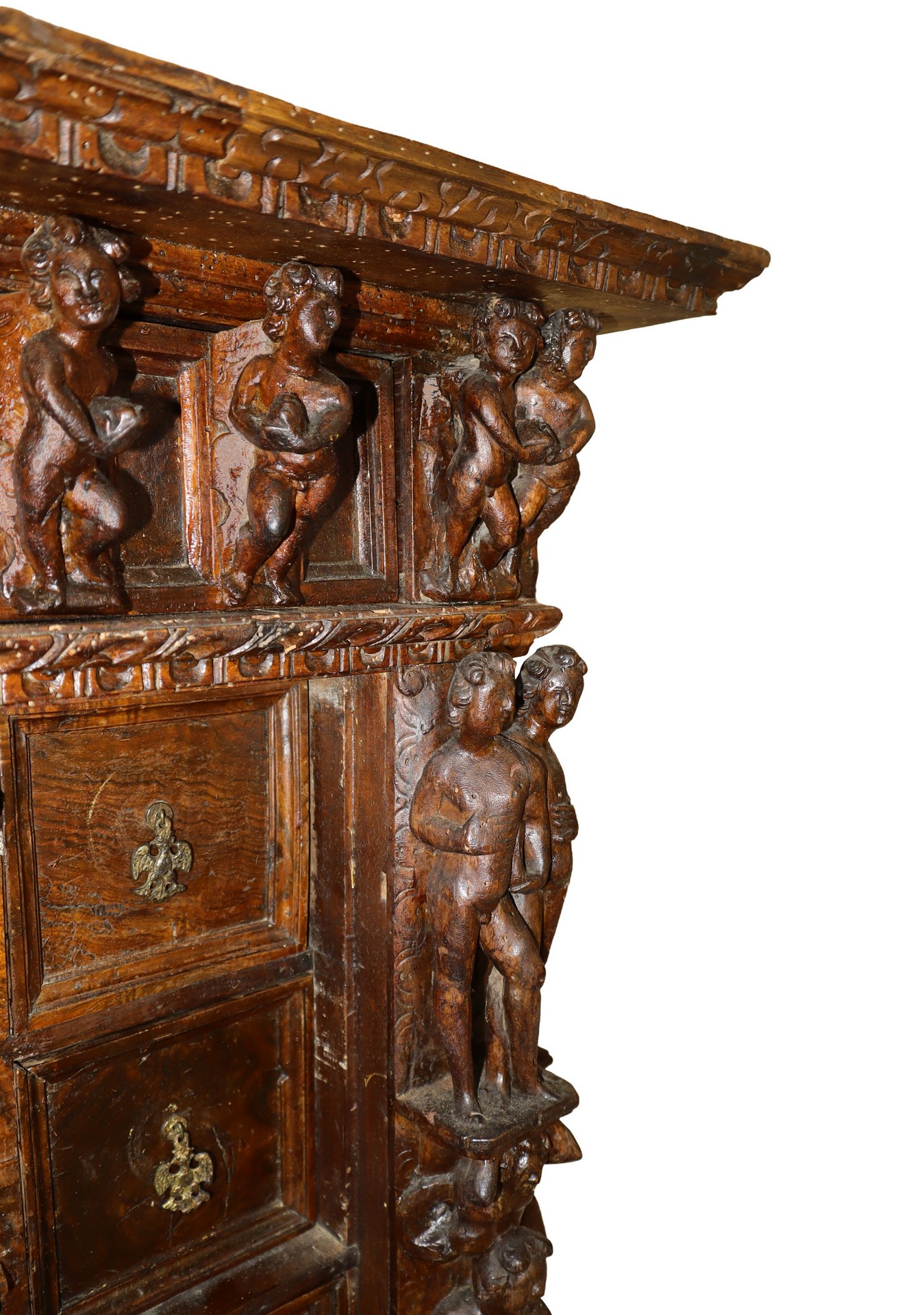 Cabinet-stipo a monetiere in radica di noce scolpito e intagliato a bambocci, Genoa 16°/17° secolo