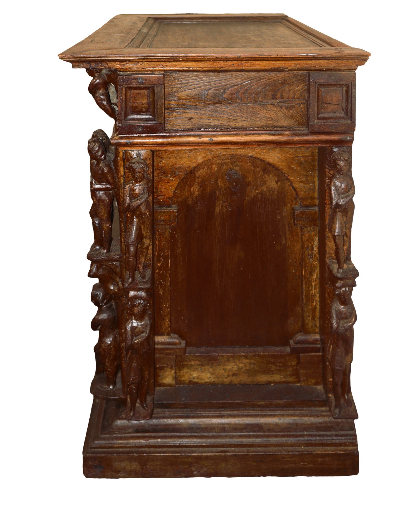 Il mobile in questione presenta entrambe queste caratteristiche, motivo per cui possiamo cronologicamente porlo alla fine del XVI/ XVII secolo, opera dei maestri intagliatori che facevano parte della Corporazione dei Bancalari la cui fondazione risale alle metà del XIII secolo.