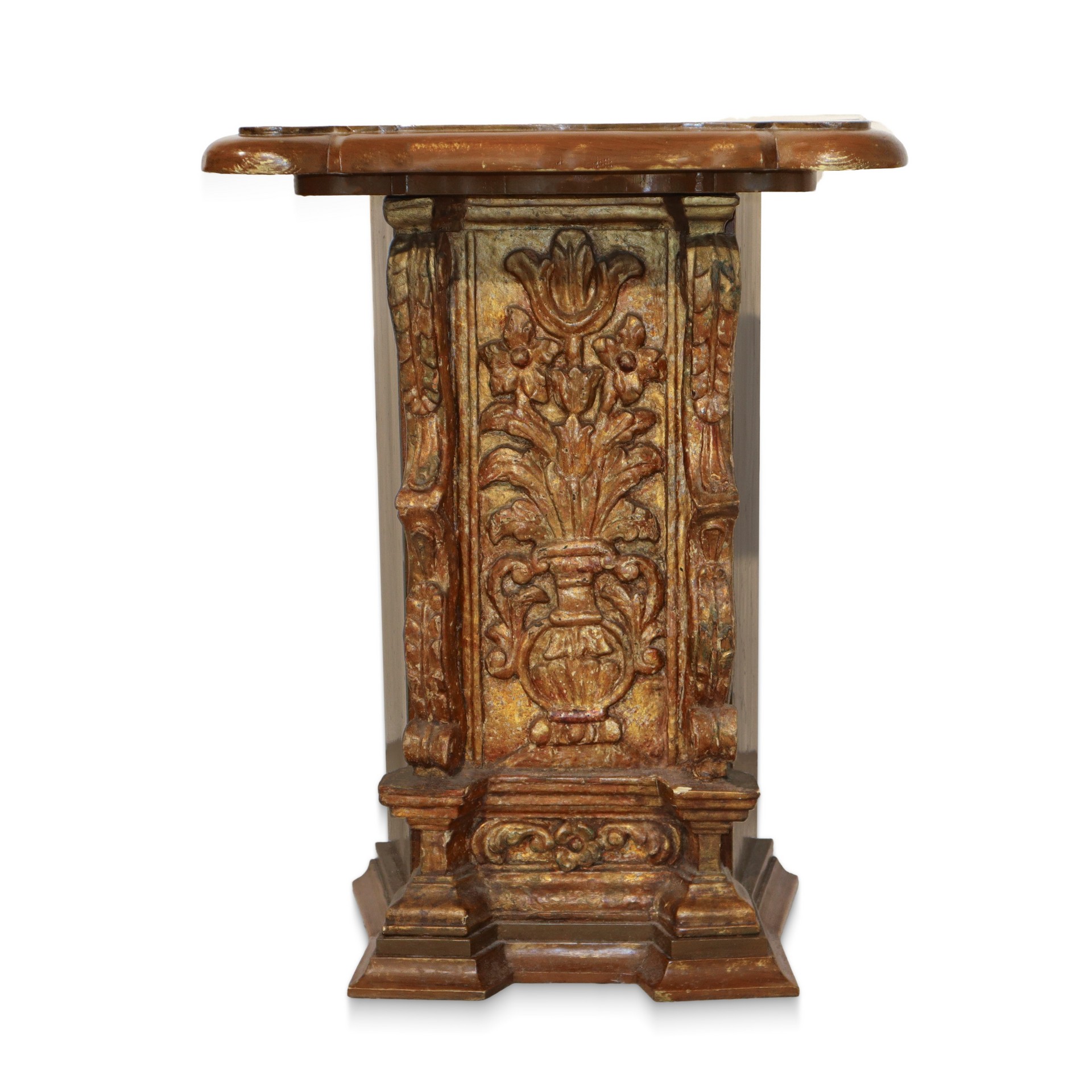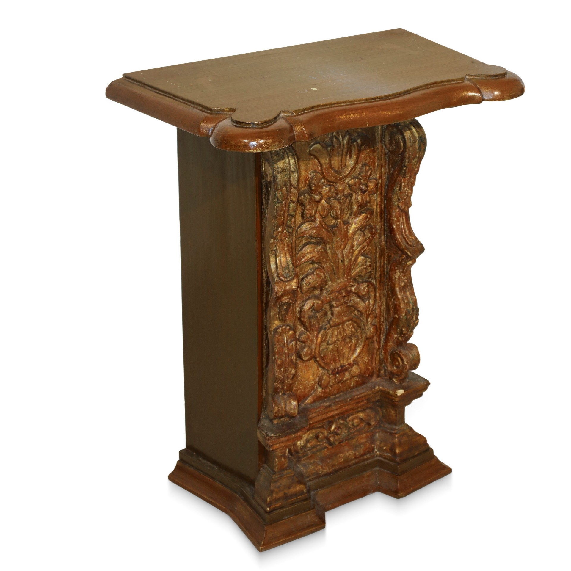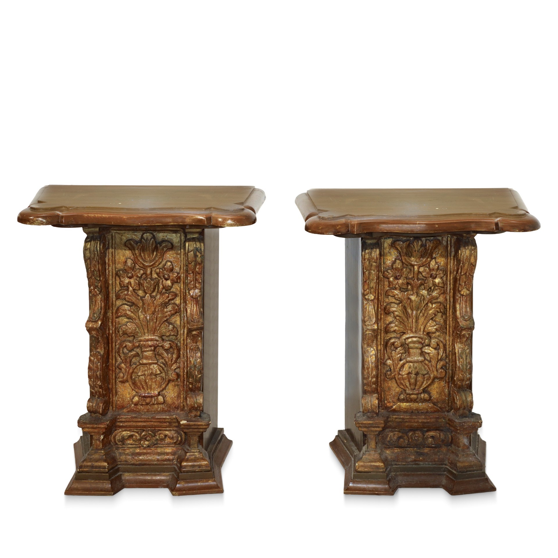 Coppia di tavolini, comodini realizzati con frammenti barocchi in legno dorato., 17° secolo