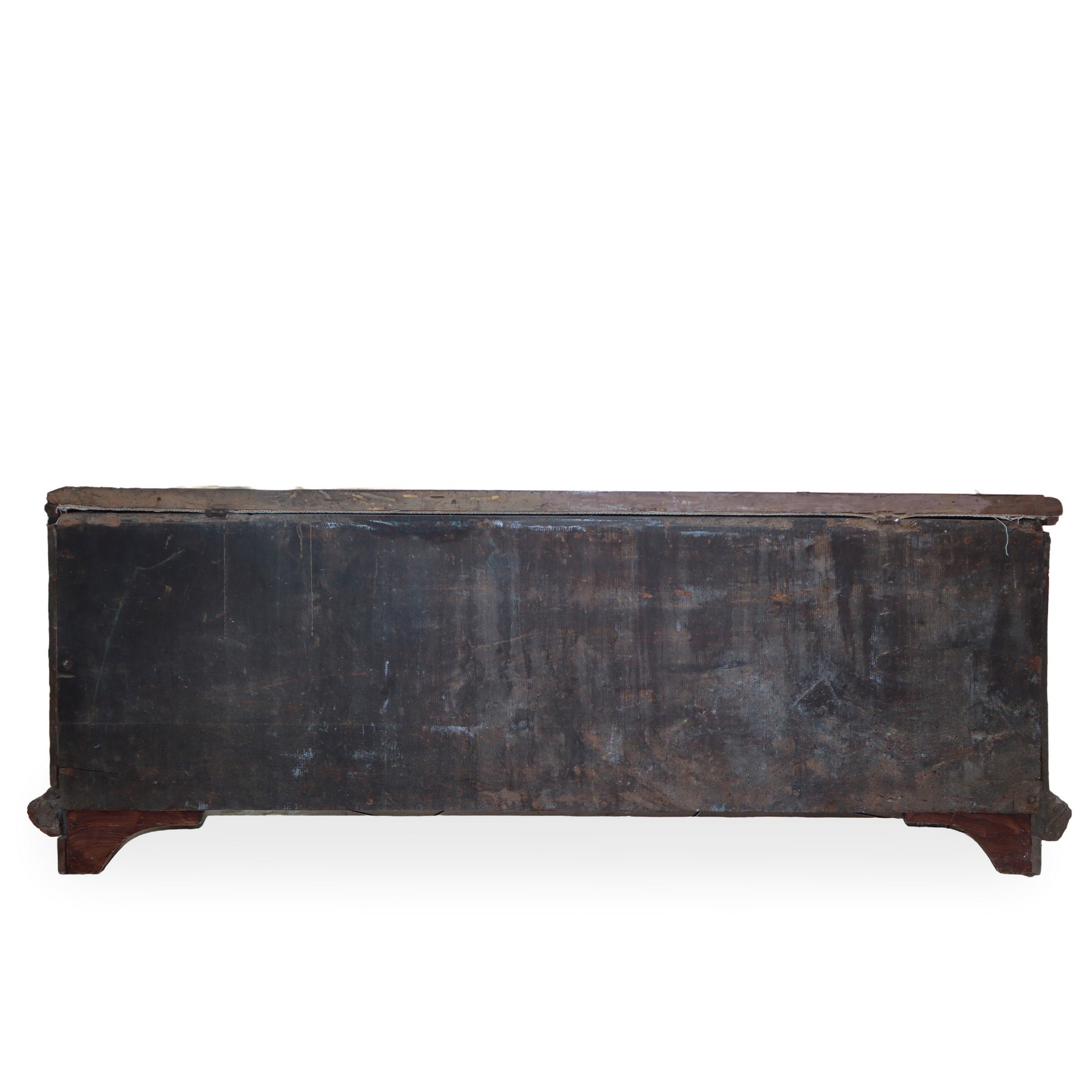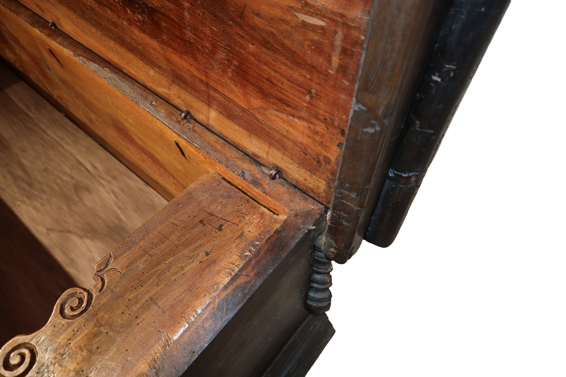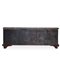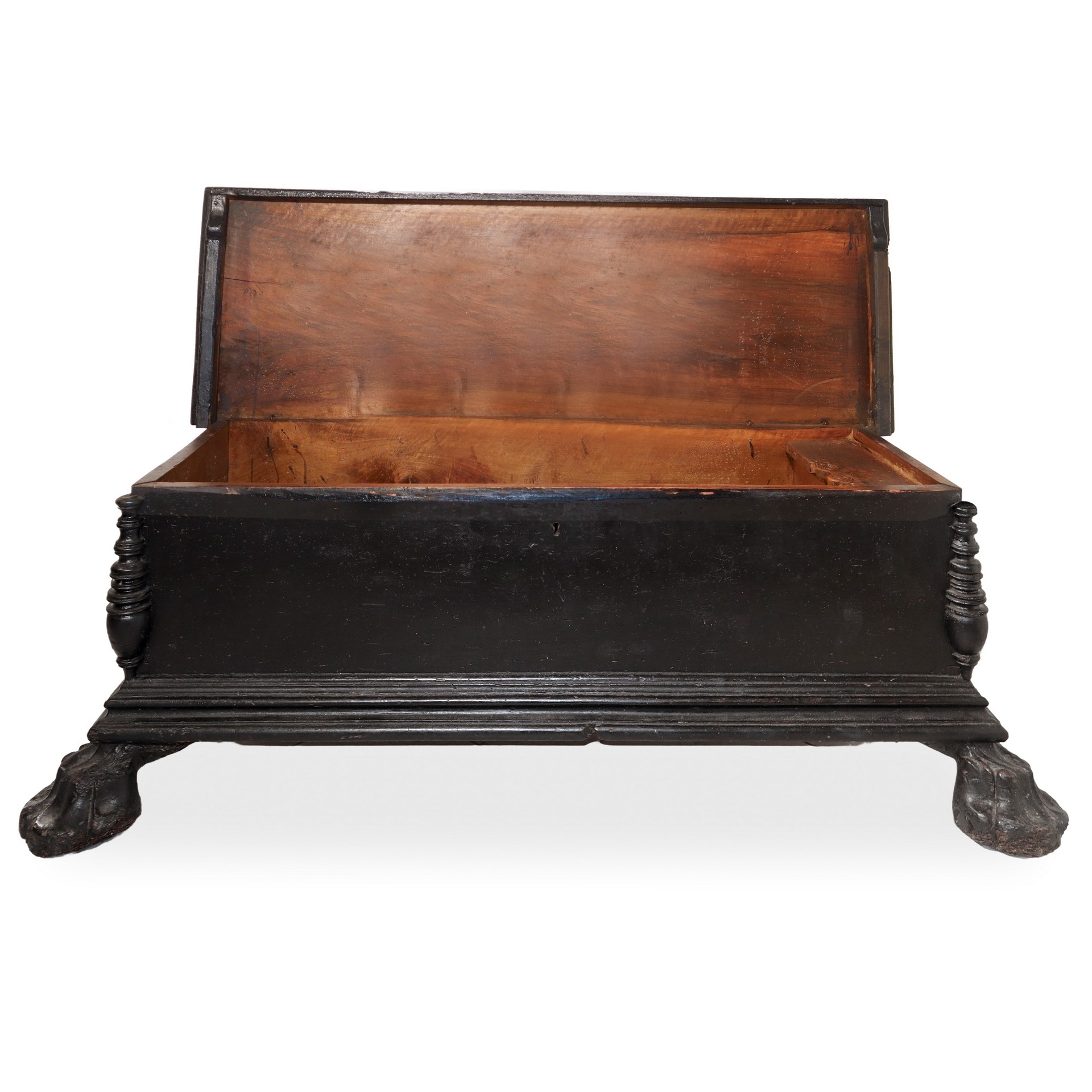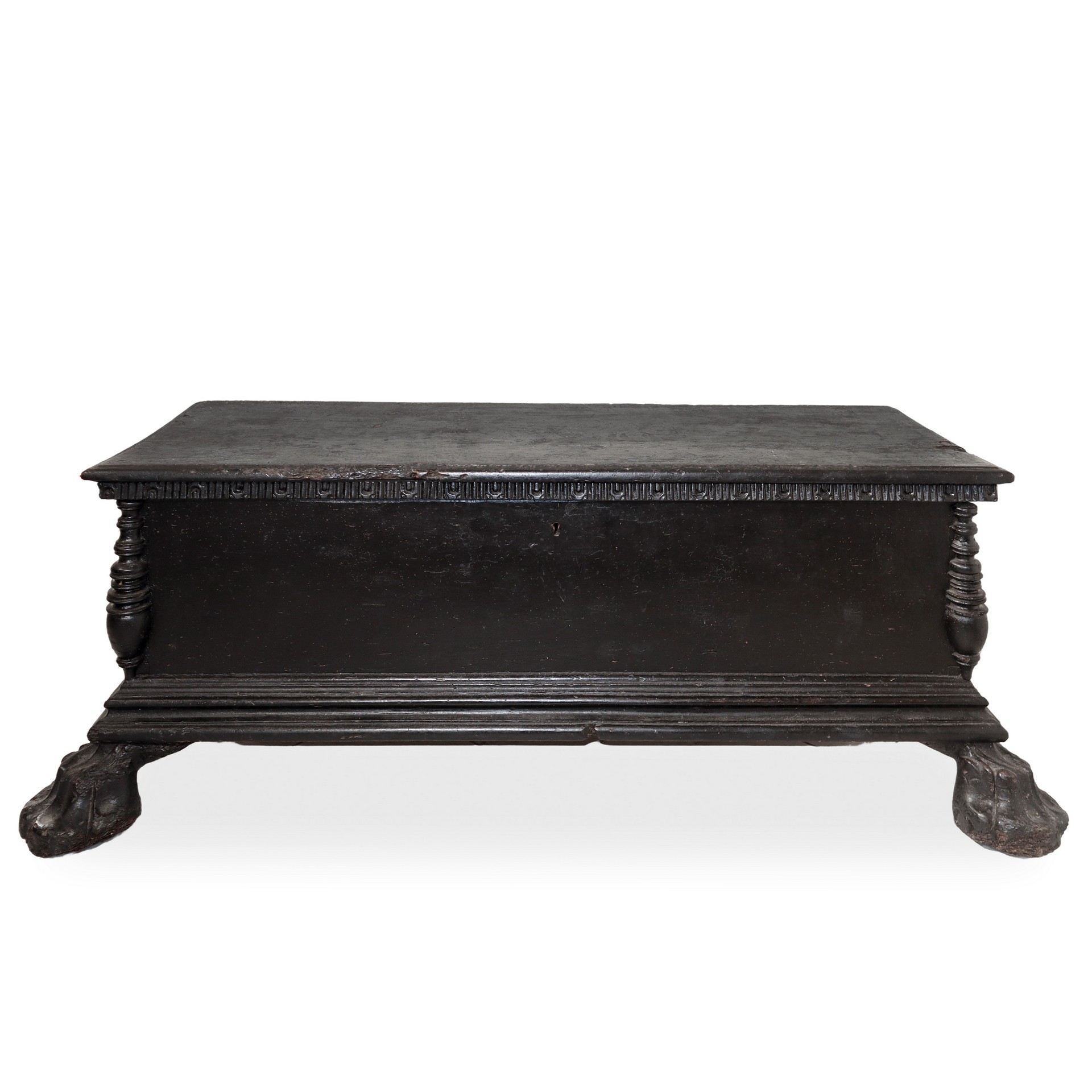 Cassapanca in legno di noce con piedi leonini dentellatura al sottopiano e colonne a rocchetto ai lati, 17° secolo