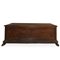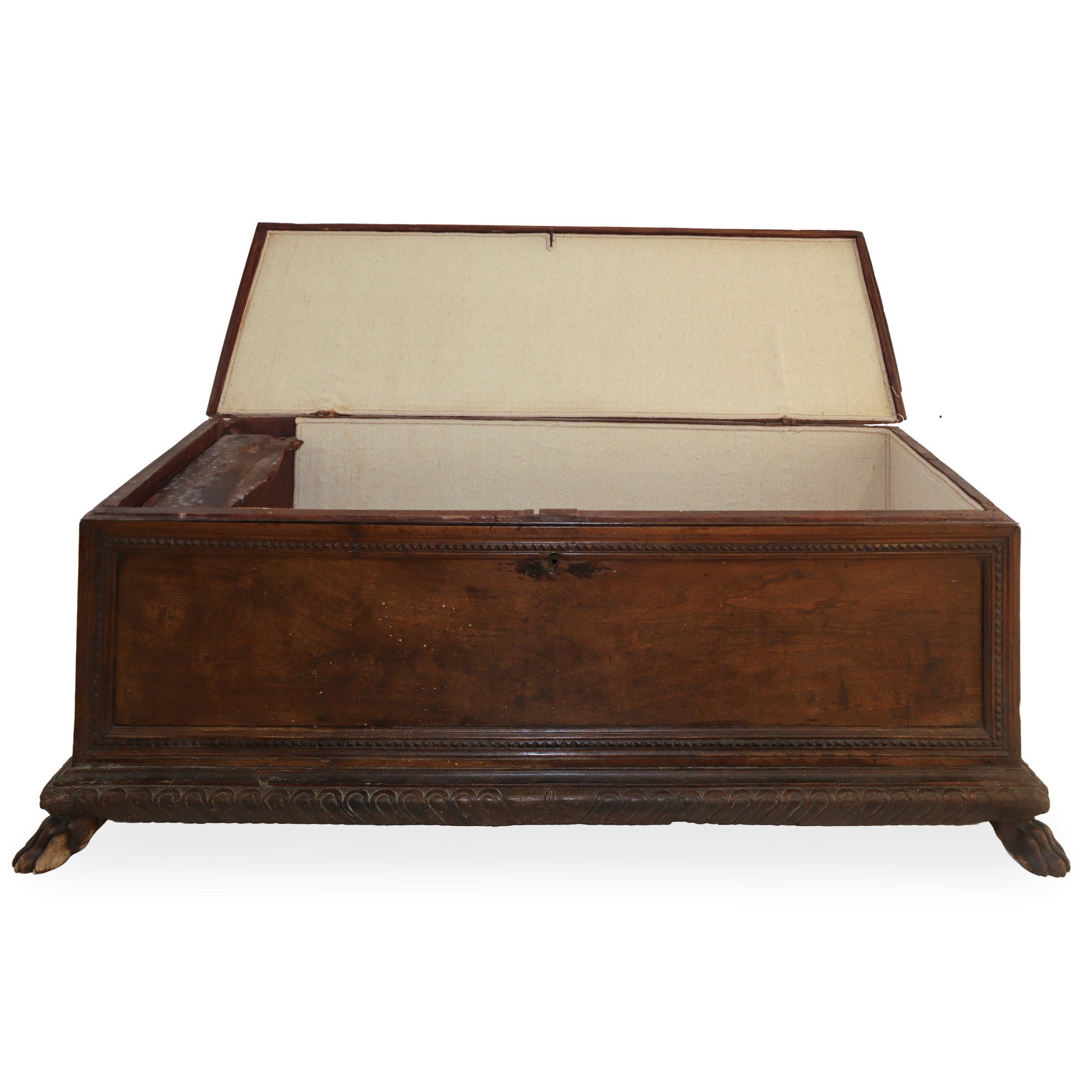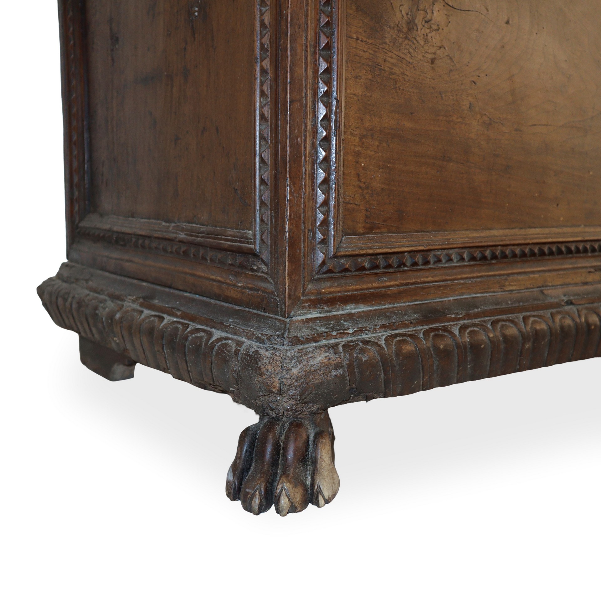 Cassapanca di legno di noce massello sul fronte cornice perimetrale con dentellatura cuspidata, base intagliata, piedi felini, 18° secolo