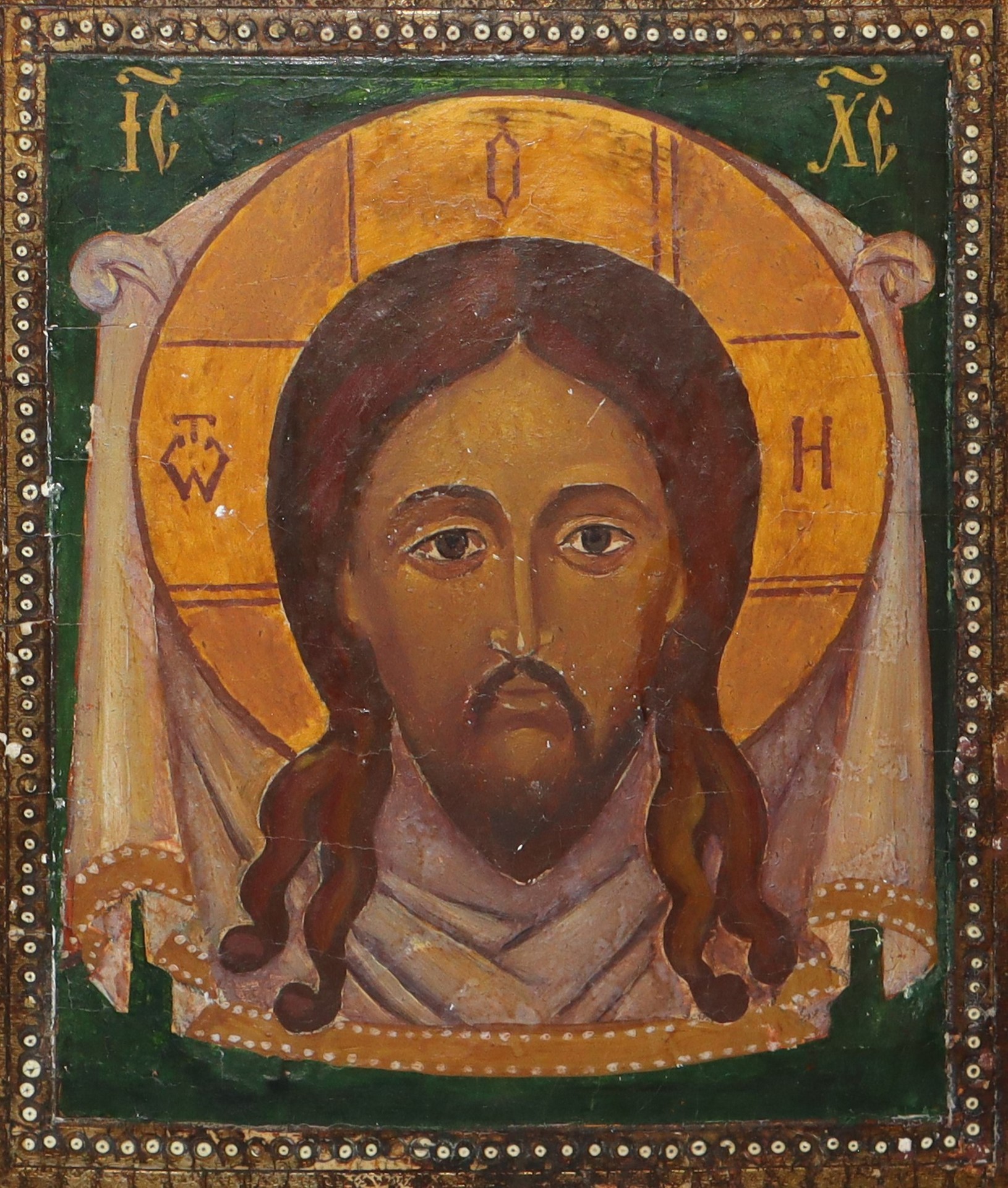 Icona russa raffigurante Santo volto di Cristo e quattro Santi ai lati, 18° secolo