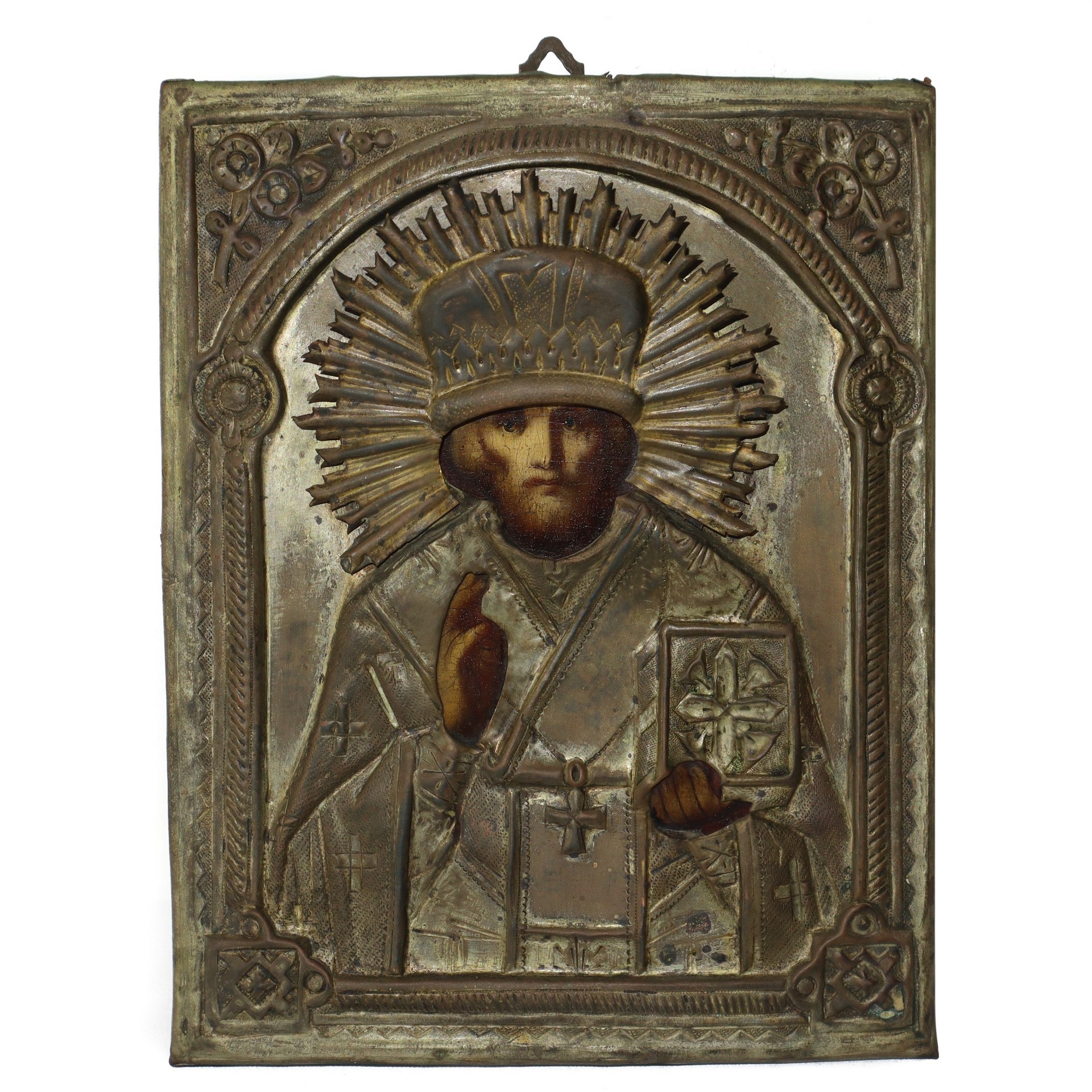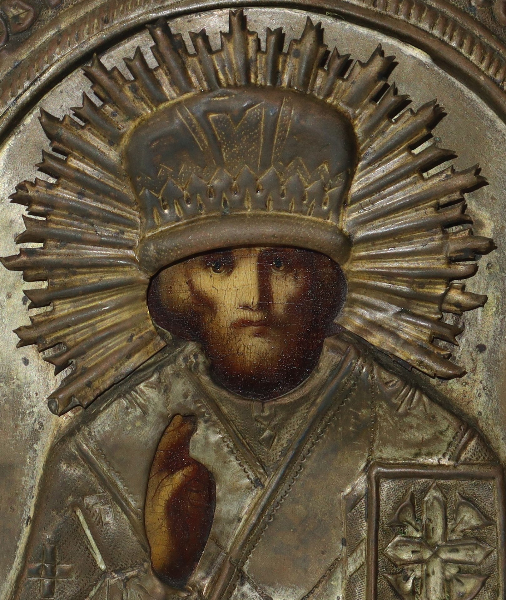 Icona russa raffigurante San Nicola, 19° secolo h cm 22,5X18 tempera su tavola Riza in metallo