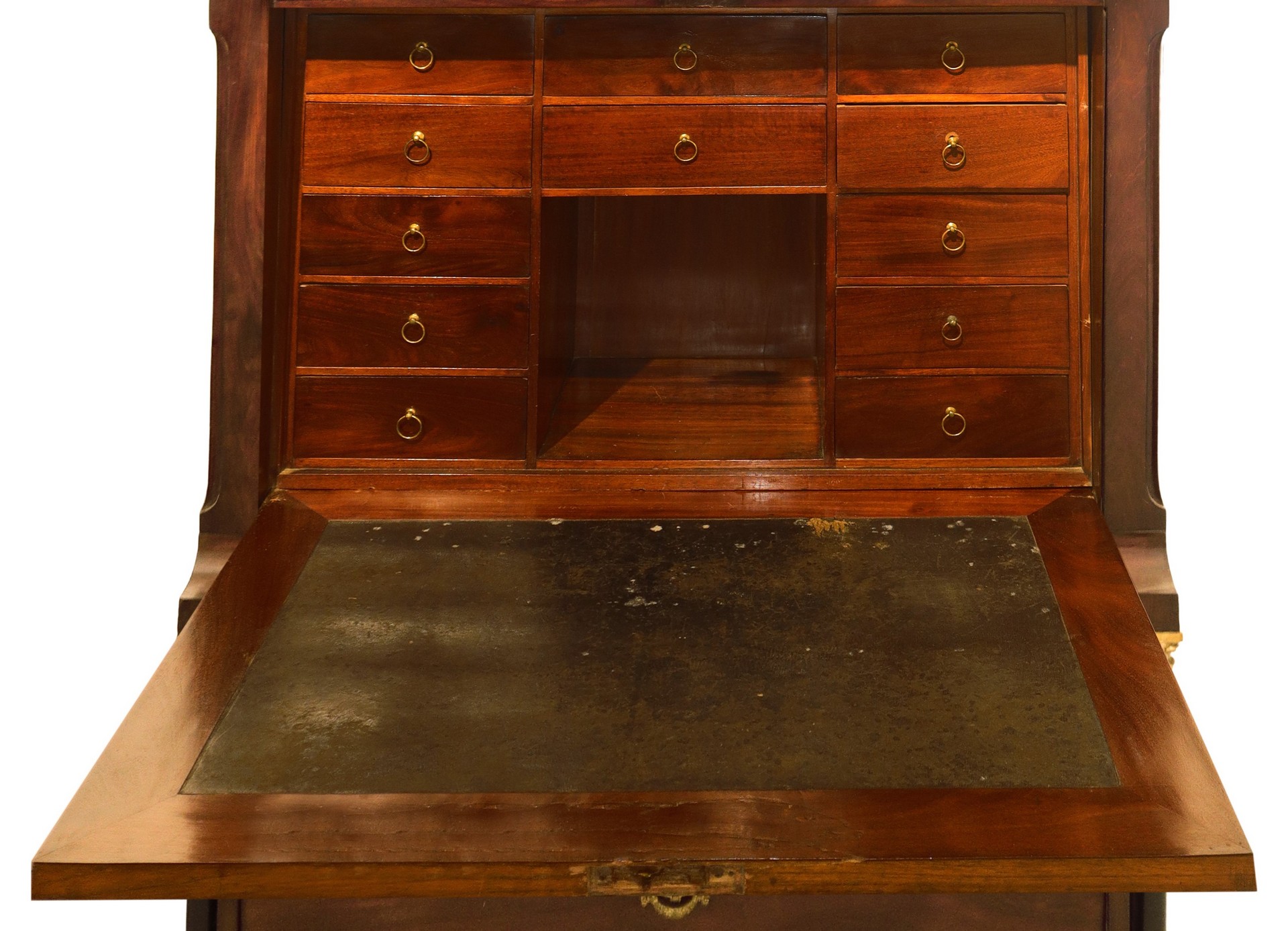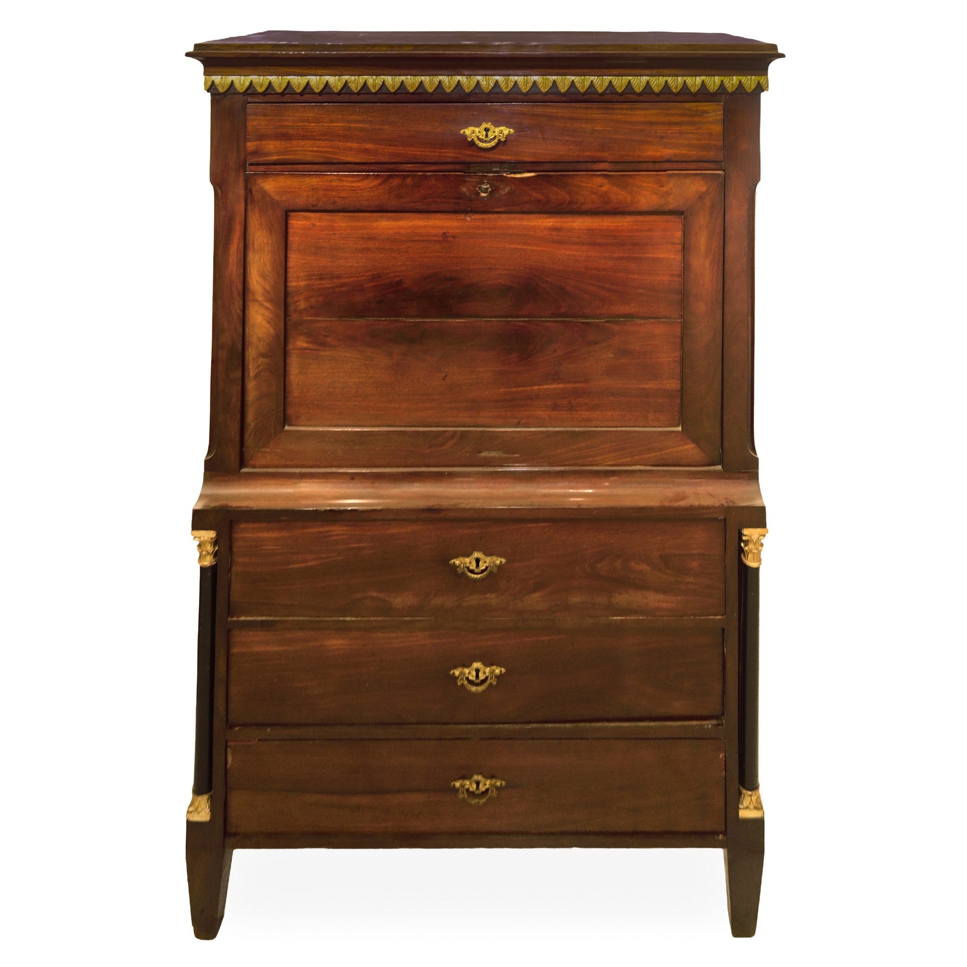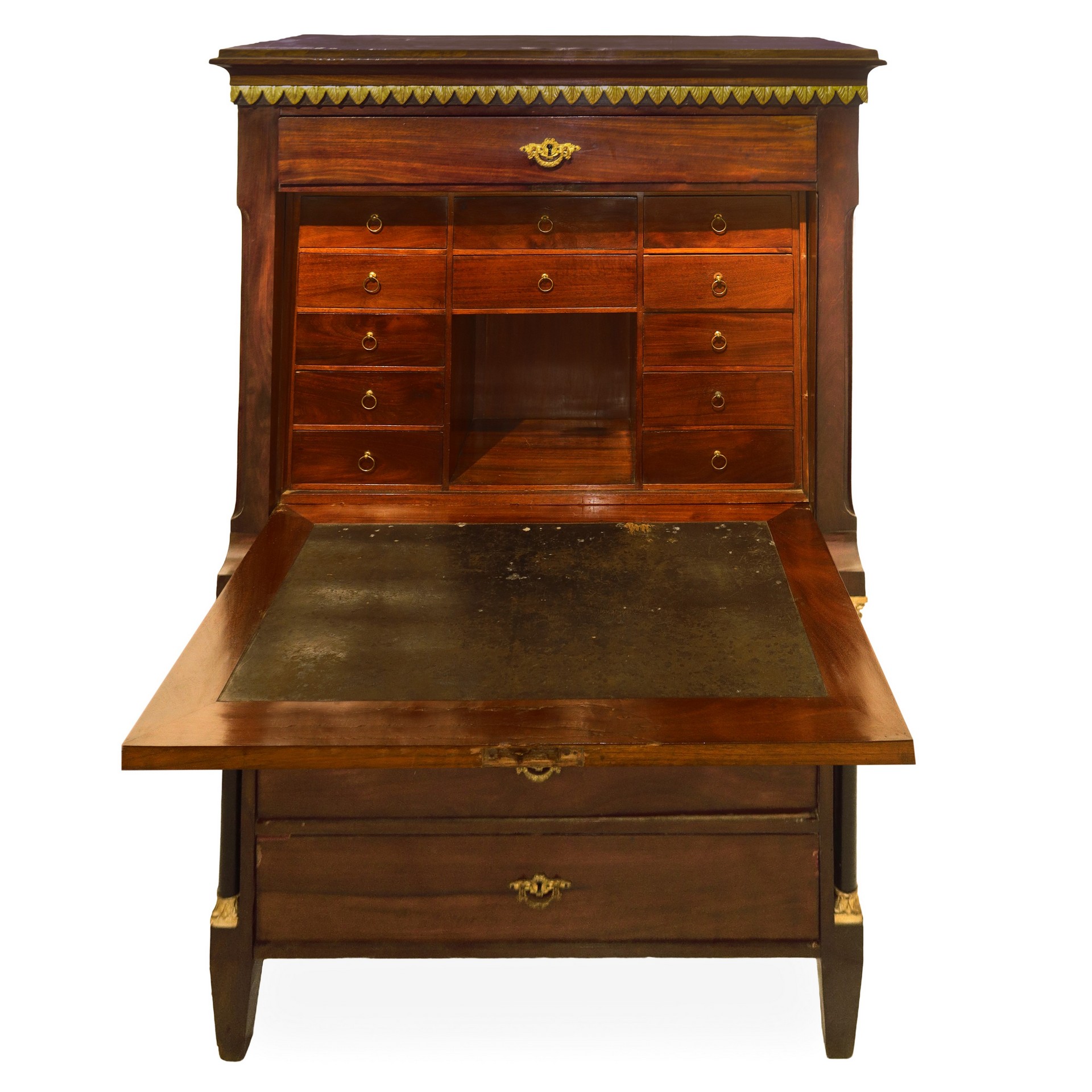 Parte superiore con calatoia ad uso scrittoio. In testa decorazioni a foglie lanceofine dorate a mecca. Interno con cassetti. Parte inferiore presenti n° 3 cassetti, ai lati colonne ebanizzate nere e capitelli a base dorata a mecca. Piede tronco-piramidale.