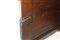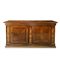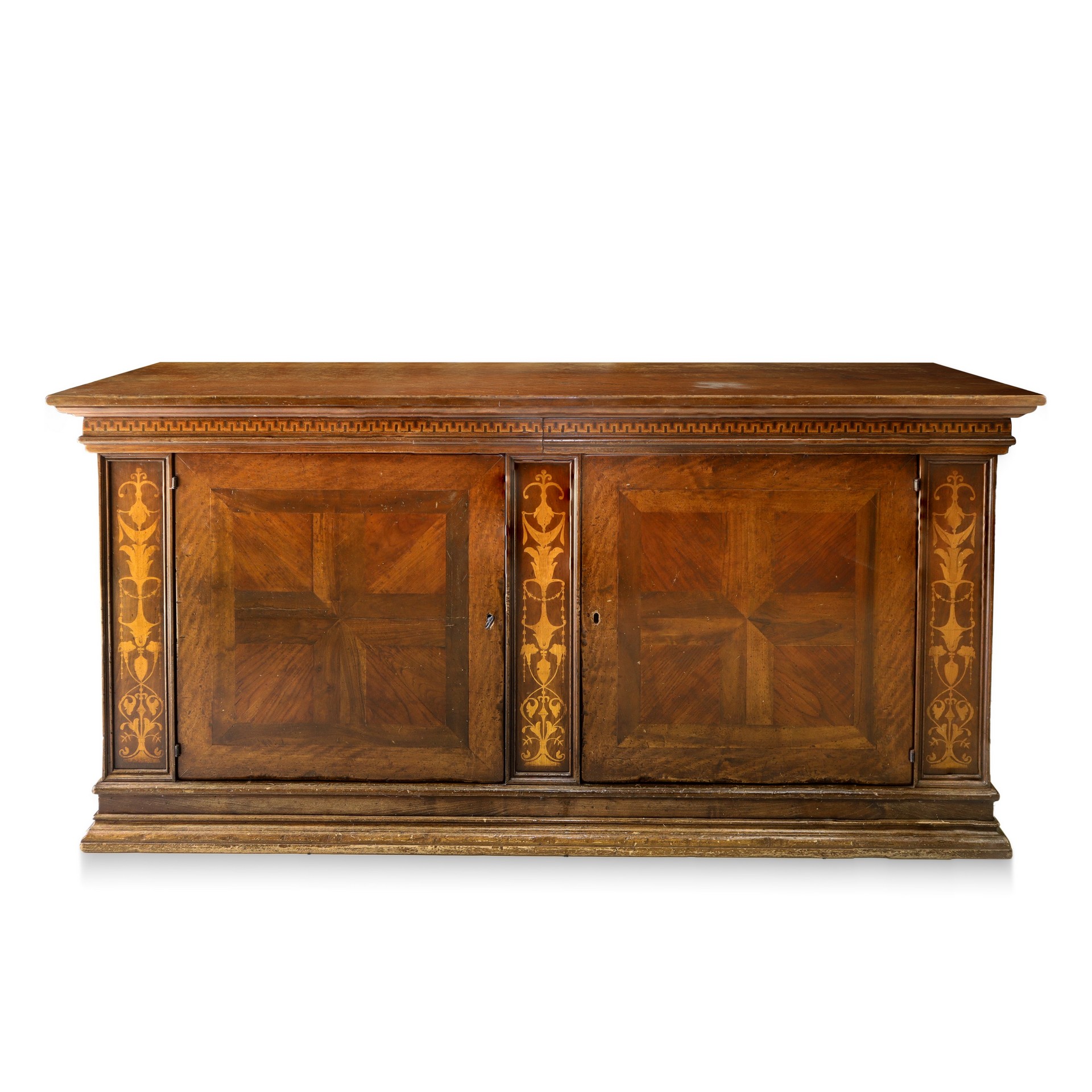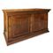 Servante in legno di noce due cassetti sottopiano, piano in noce a becco di civetta, due sportelli alla base con intarsi in legni chiari ai lati alla base cornice a scalare, Italy 20° secolo h cm 110X230X68