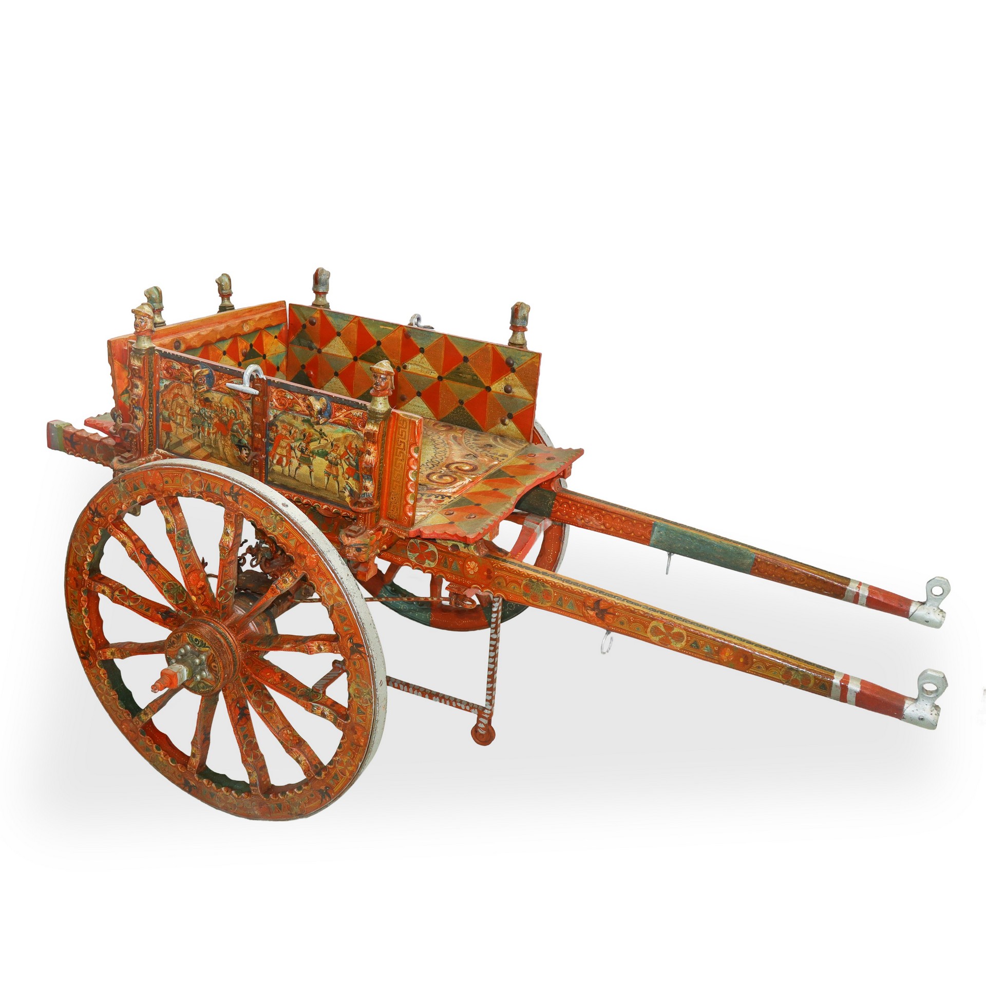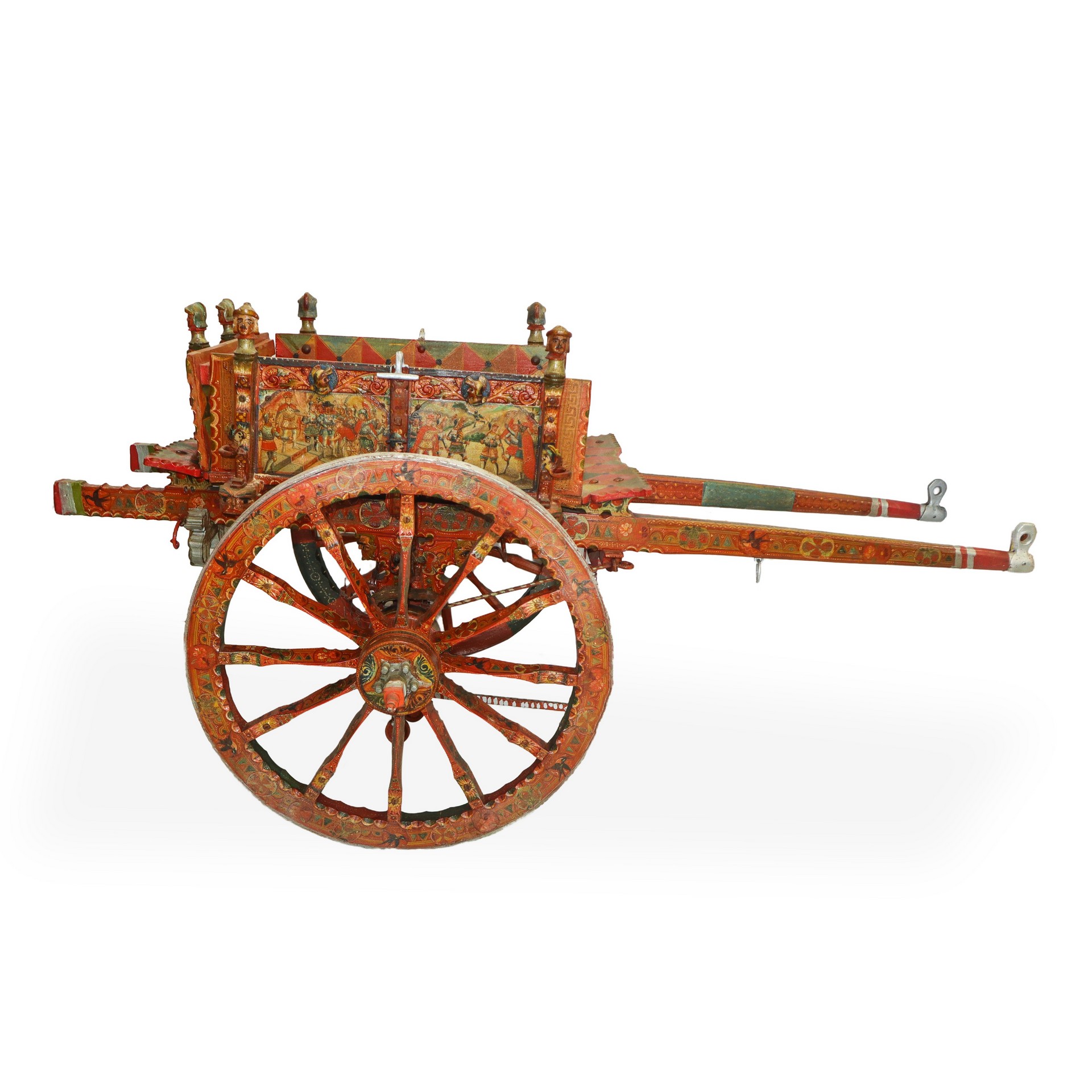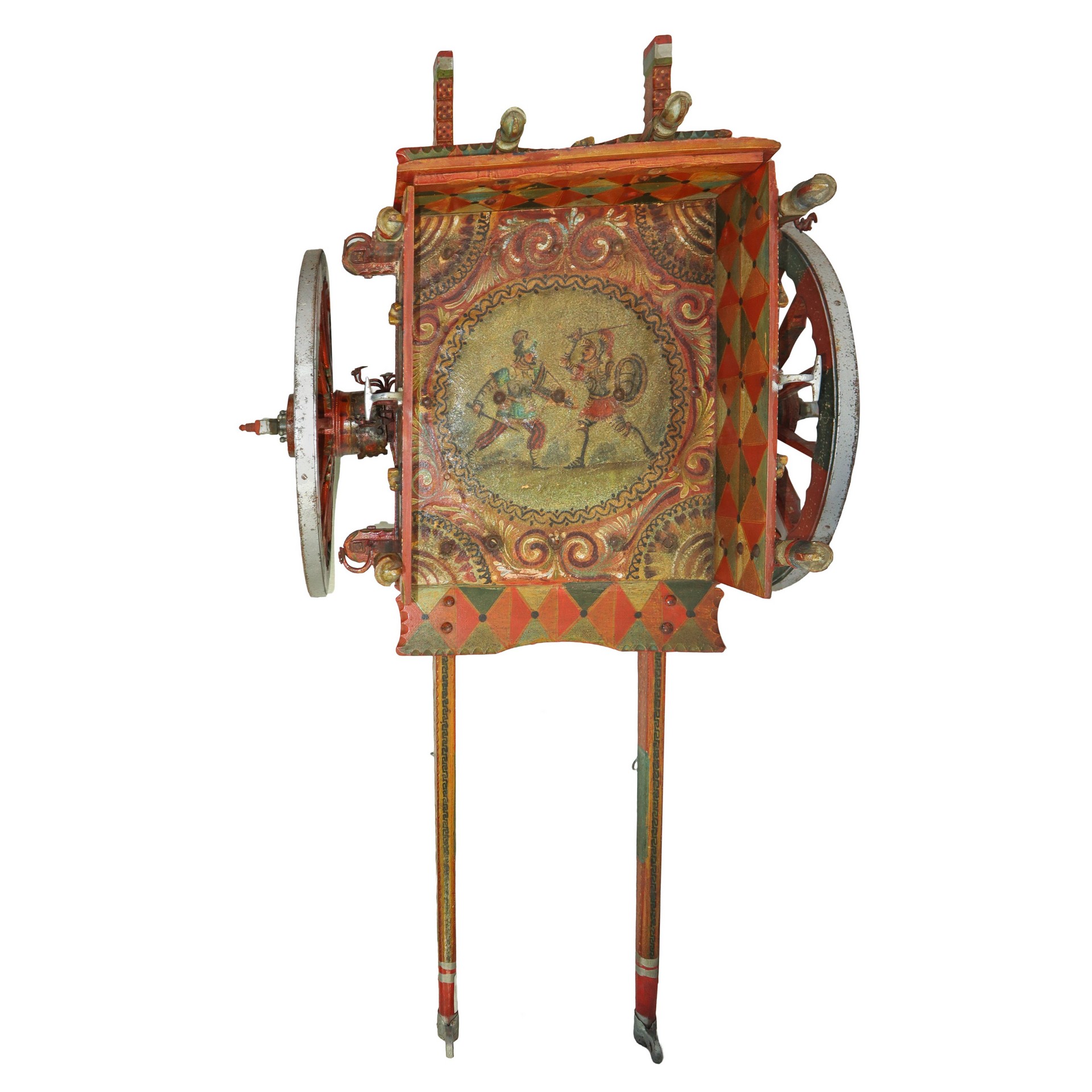 Domenico Di Mauro - Francesco Giuffrida (Guardia Mangano 1913-Aci S. Antonio 2016, Belpasso) - Carretto siciliano in legno con dipinte scene di battaglia dei Paladini cm 70X70X150 Dipinto da Domenico Di Mauro. Costruito dal Carratore Francesco Giuffrida.Dipinto da Domenico Di Mauro. Costruito dal Carratore Francesco Giuffrida.