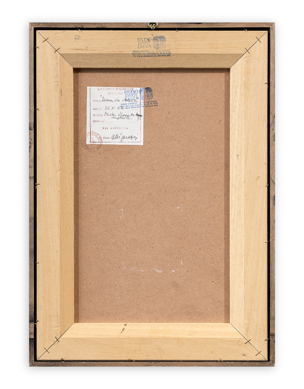 Etichetta con caratteristiche tecniche dell'opera e timbro dell'Artista al retro