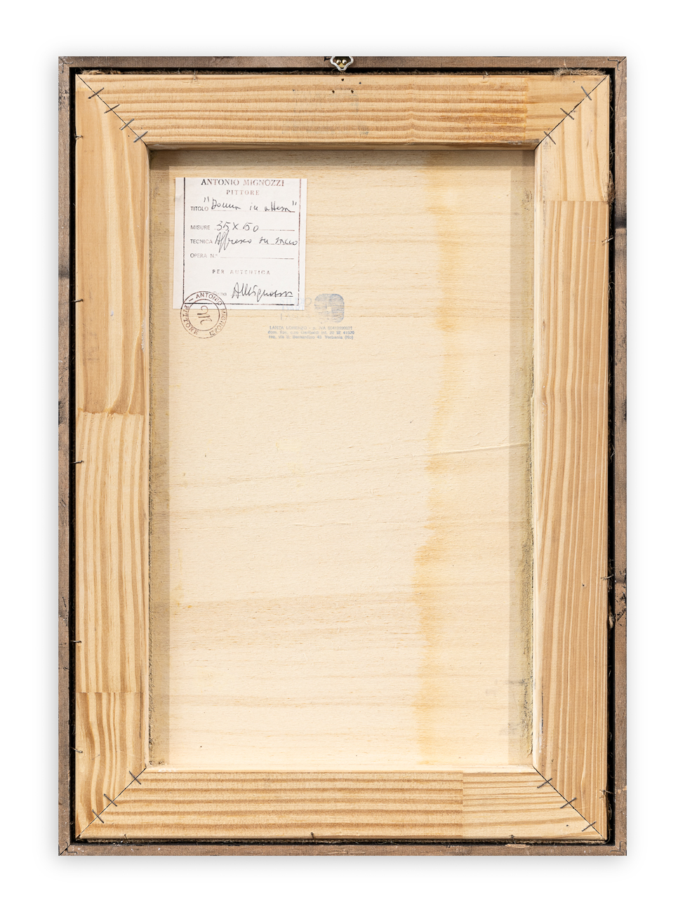 Etichetta con caratteristiche tecniche dell'opera e timbro dell'Artista al retro