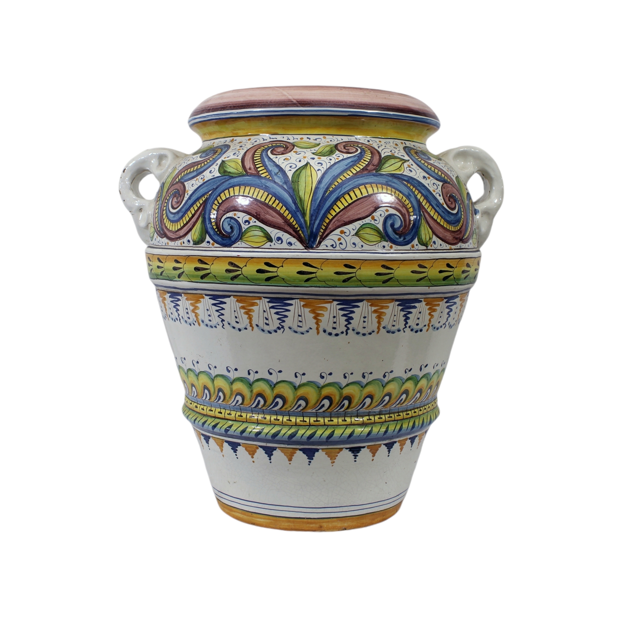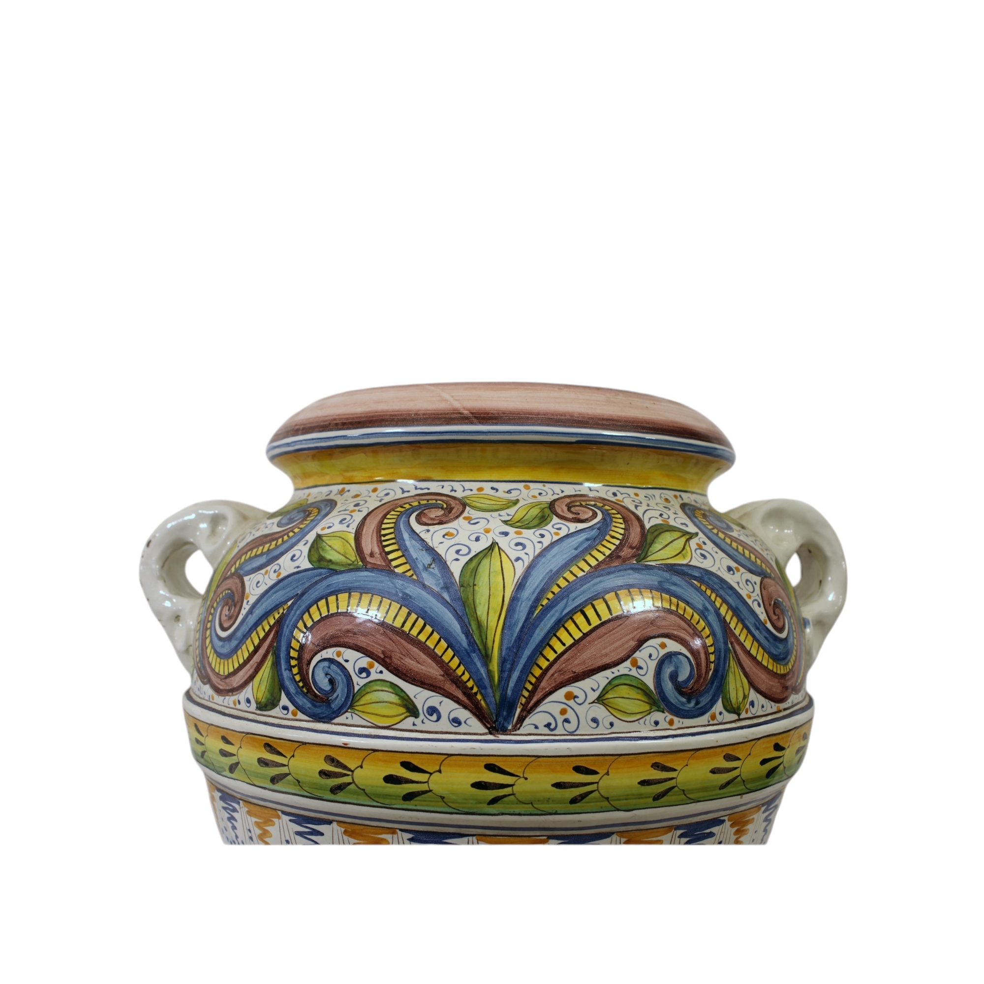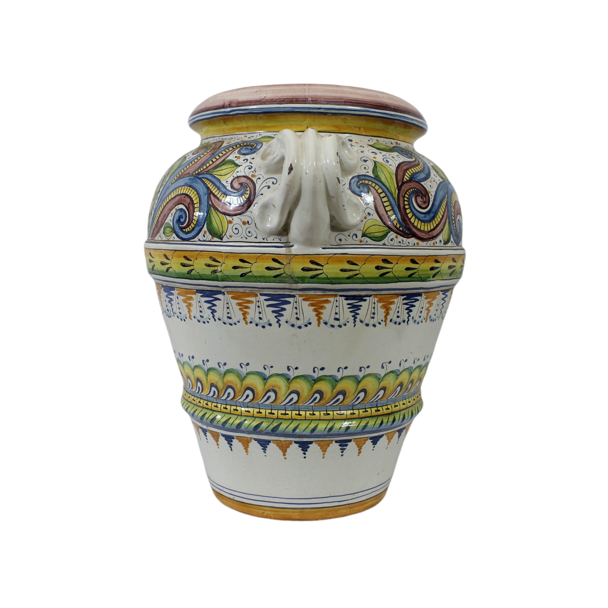 GRANDE ORCIO in maiolica policroma a fondo bianco maestranze siciliane XX secolo maestranze siciliane XX secolo h cm 60 x 55 x 55