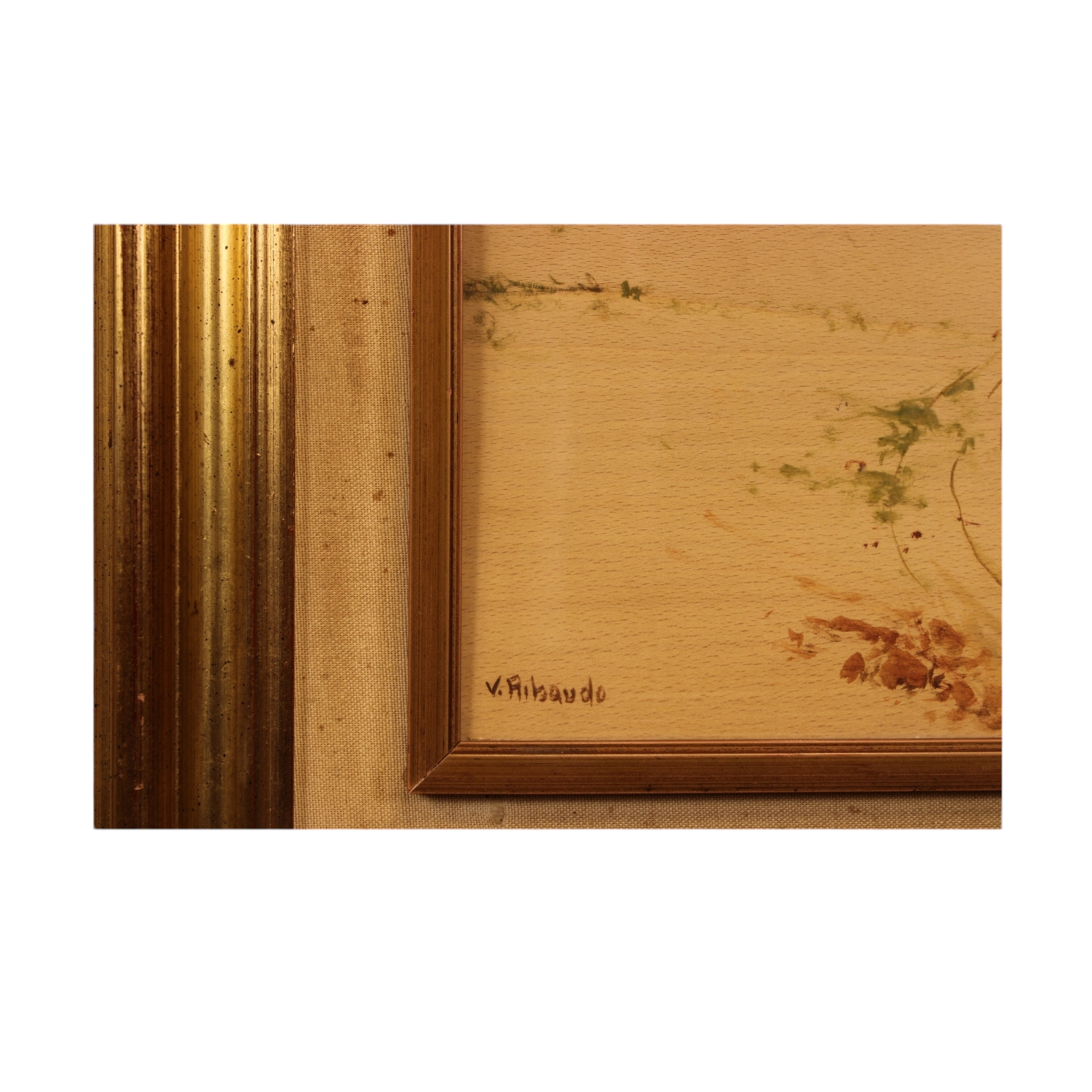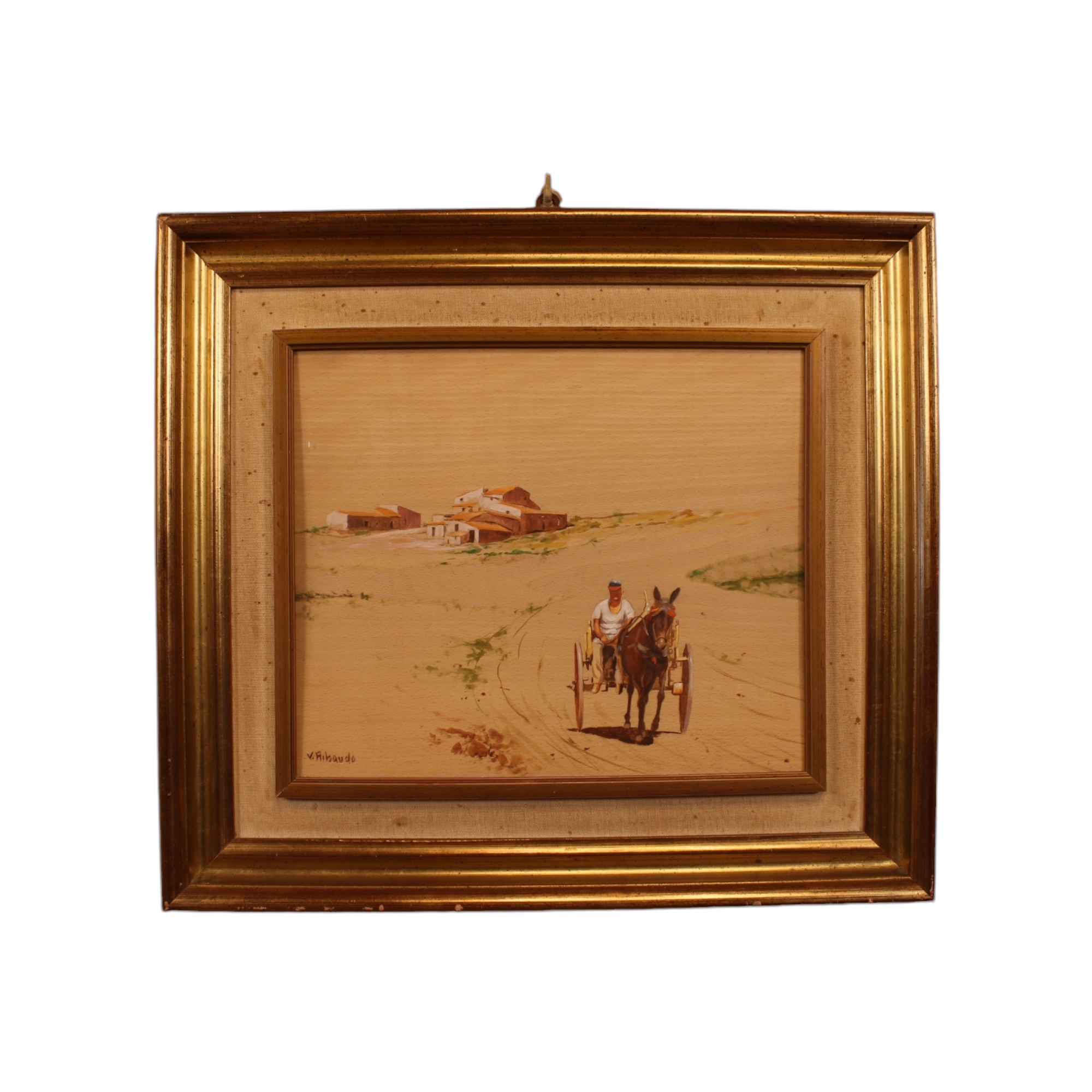 V. RIBAUDO OLIO SU TAVOLA raffigurante contadino su carrettino con cavallo dentro cornice dorata con teca vetrata h cm 33x40 / cornice h cm 56 x 62,5