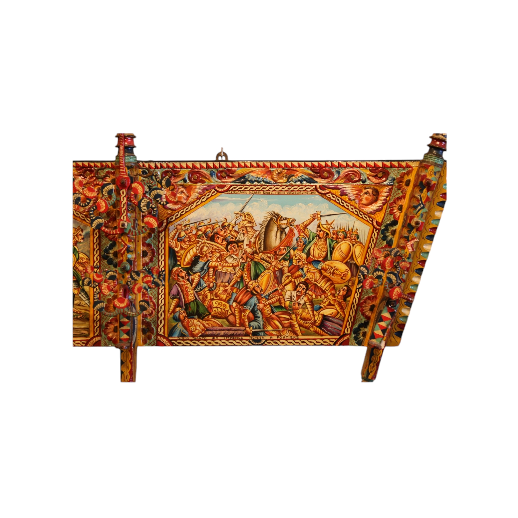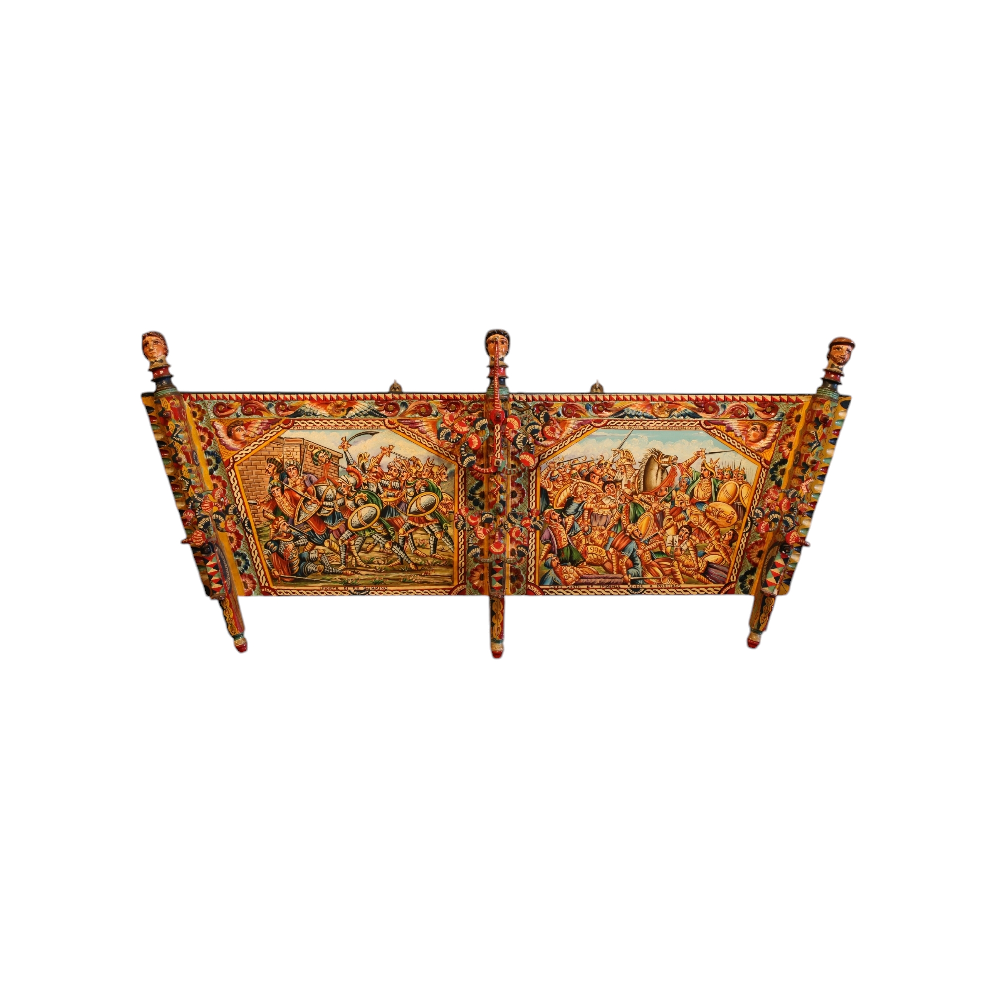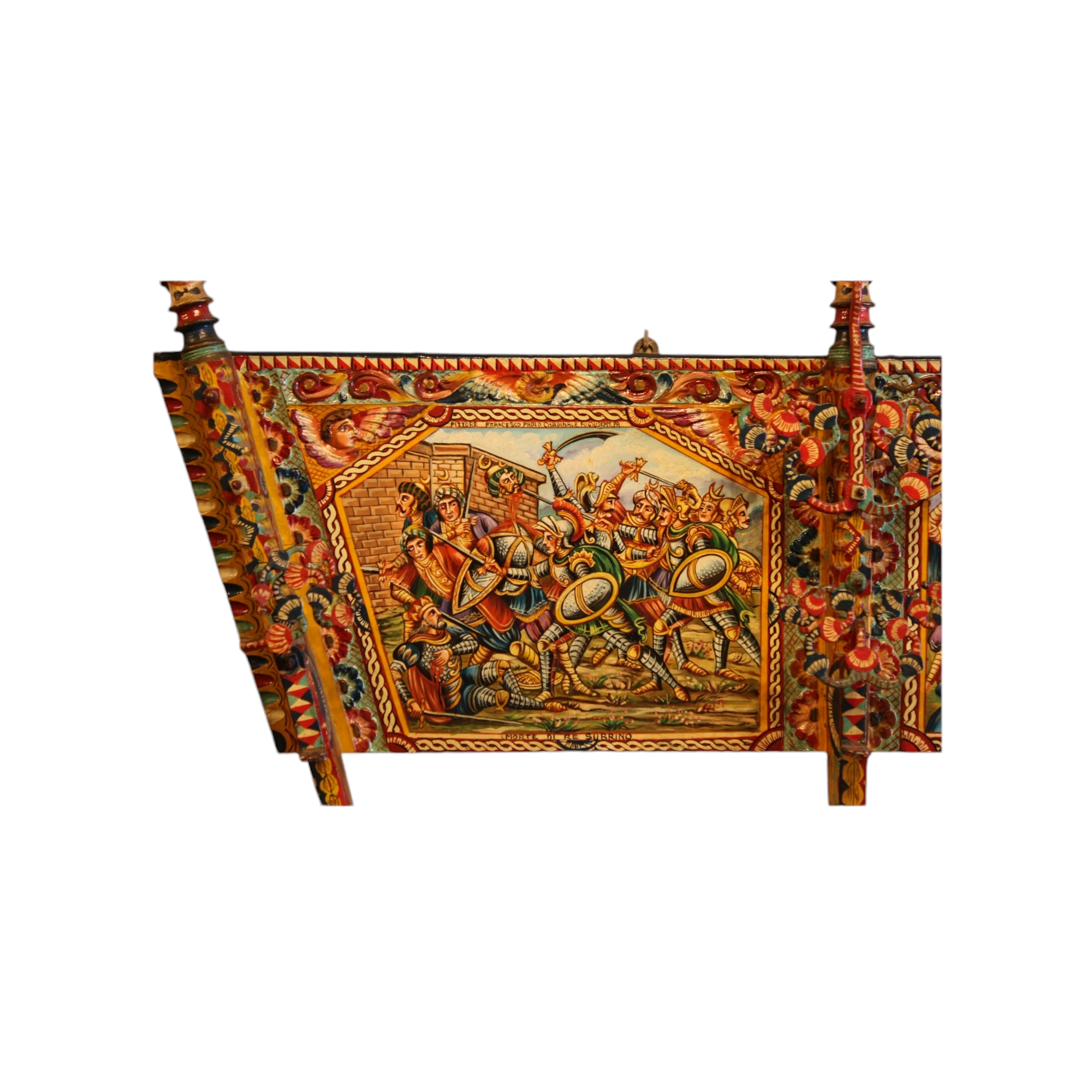 PICCOLA SPONDA DI CARRETTO in legno scolpito, applicazioni in ferro, dipinto in policromia raffigurante morte di Re Subrino e Guido Santo tra rovine a Poiters pitturato da Francesco Paolo Cardinale fu Giuseppe costruttore di carri Raia Giovanni XX secolo XX secolo h cm 111 x 50