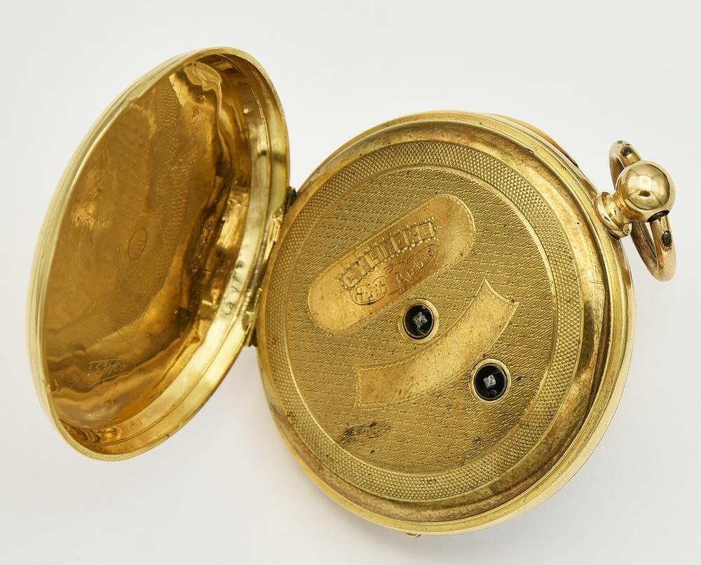 CASSA: in oro 18K lavorata a sbalzo e incisione; referenza e punzone dell'oro (testa di cavallo) presente sulla superficie interna del fondello piu' esterno; sulla superficie esterna del fondello piu' interno: inciso "Cylindre/huit rubis"
