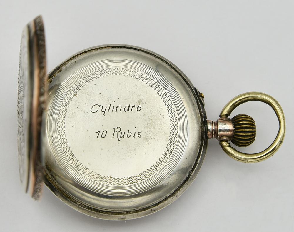 CASSA: in metallo con doppio fondello lavorata a sbalzo e incisione; referenza visibile sulla superficie interna di entrambi i fondelli; sulla superficie esterna del fondello piu' interno inciso: "Cylindre/10 Rubis"