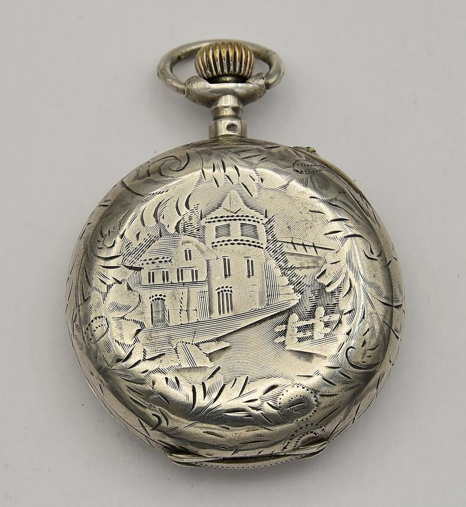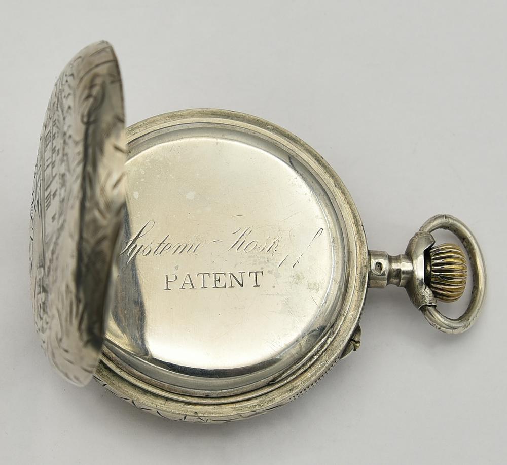 CASSA: in metallo, a tripla struttura con doppio fondello e chiusura, lavorata ad incisione sia sul fronte (cavallo) che sul retro (paesaggio); referenza visibile sulla superficie interna di entrambi i fondelli e della chiusura; sulla superficie esterna del fondello piu' interno inciso: "Systeme Roskopf/Patent"