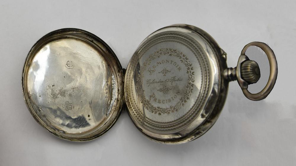 CASSA: in argento con doppio fondello, lavorata a sbalzo e incisione; referenza, titolo e punzone dell'argento (gallo) visibili sulla superficie interna di entrambi i fondelli; sulla superficie esterna del fondello piu' interno inciso: "REMONTOIR/Cylindre 10 Rubis/PRECISION"