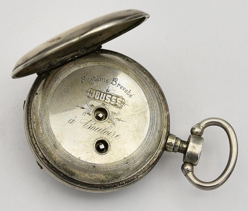 CASSA: in argento con doppio fondello lavorata a sbalzo e incisione, punzone dell'argento (granchio) ben visibile sulla superficie interna del fondello piu' interno; referenza leggibile sulla superficie interna di entrambi i fondelli; sulla superficie esterna del fondello piu' interno inciso: "Systeme Brevet/JOUSSE/a Buloire"