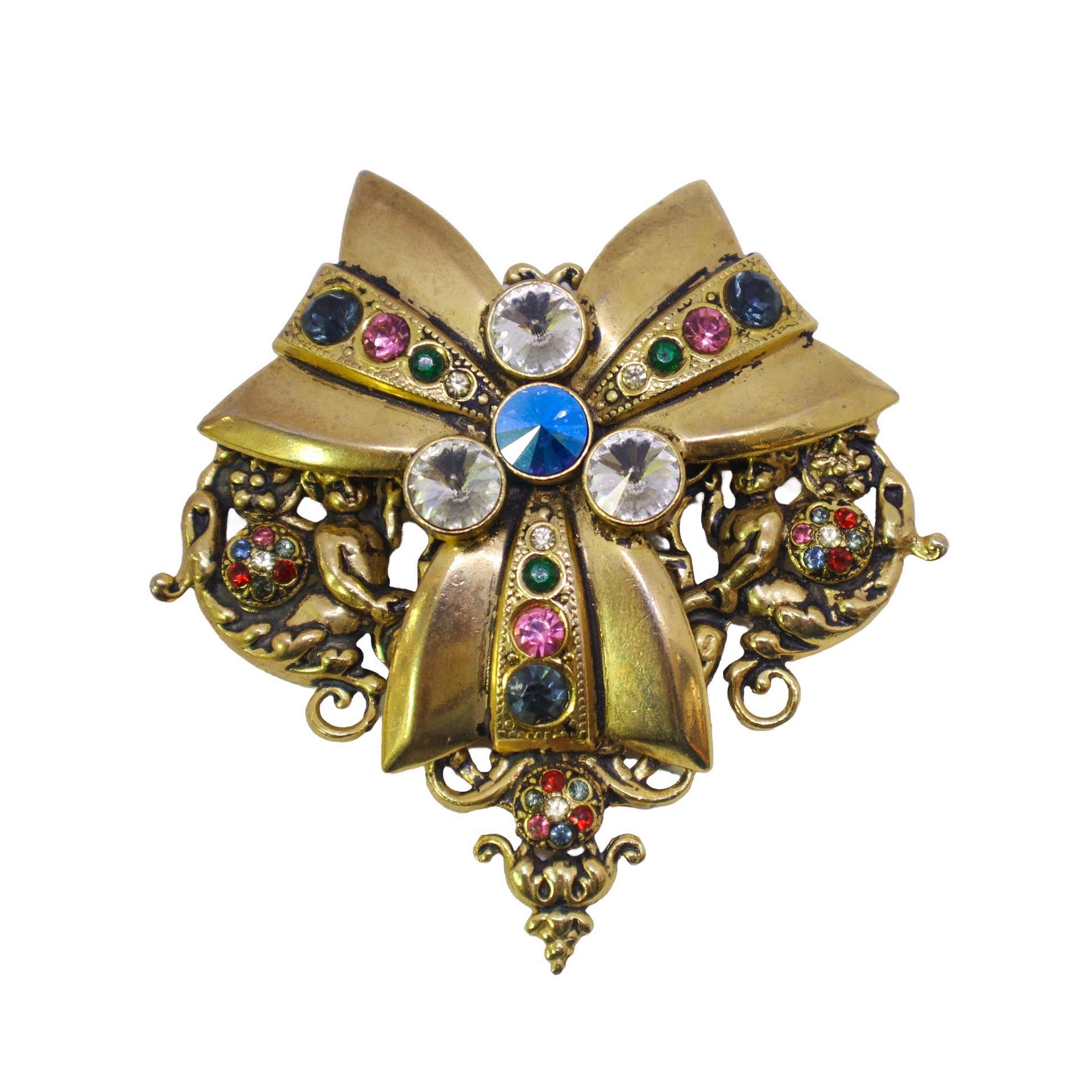 Spilla a cuore con fiocco centrale con strass colorati ai lati piccoli angioletti