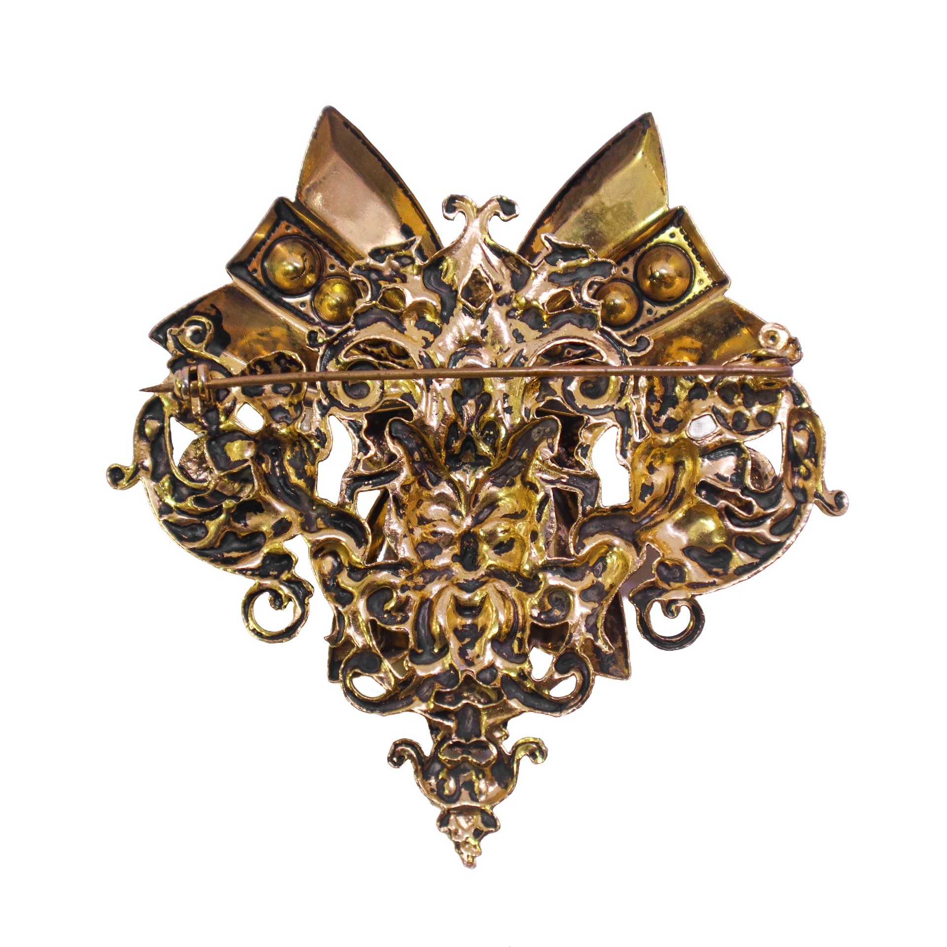 Spilla a cuore con fiocco centrale con strass colorati ai lati piccoli angioletti h cm 8X8