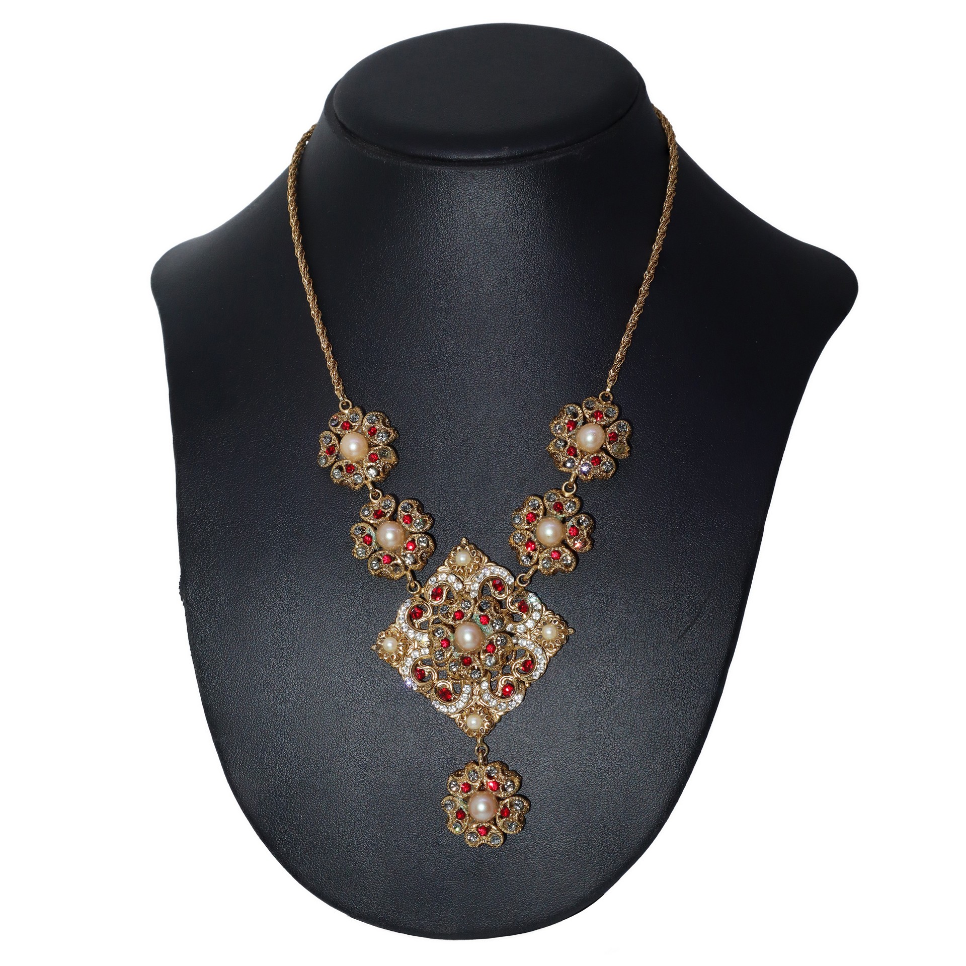 Bozart Bijoux - Collana con catena dorata e filigranata, pietre rosse , perle e strass Segni di ossidazione.Segni di ossidazione.