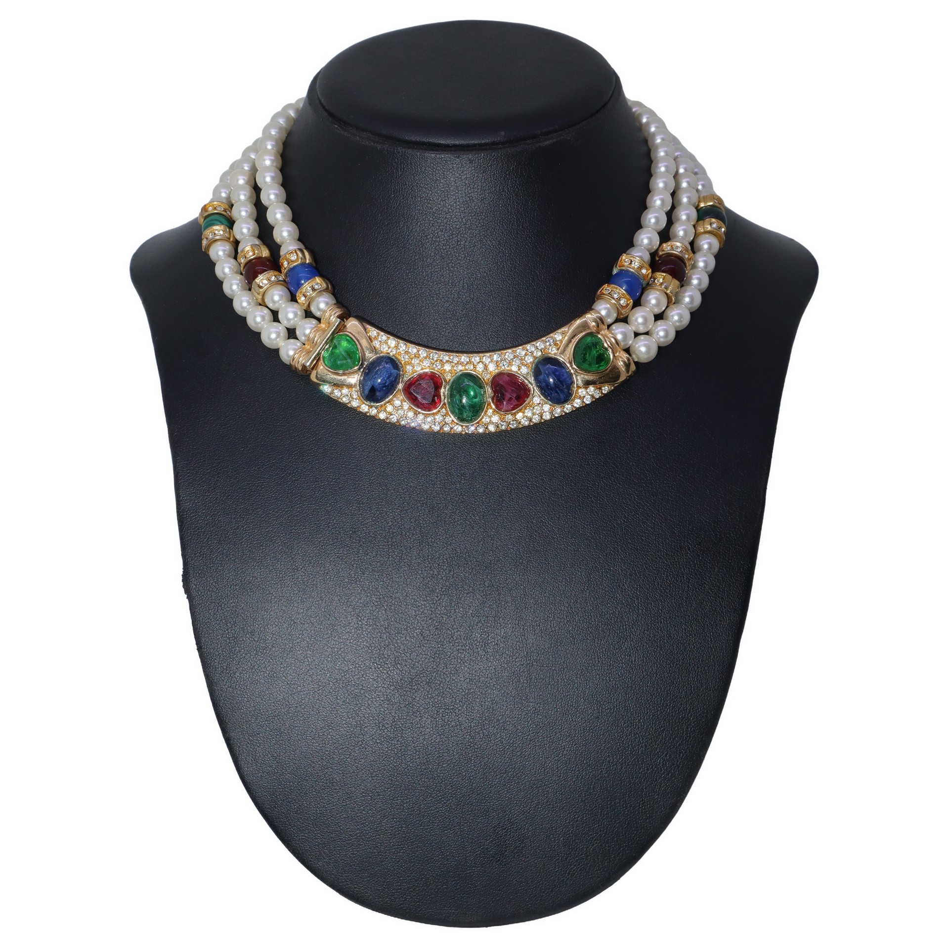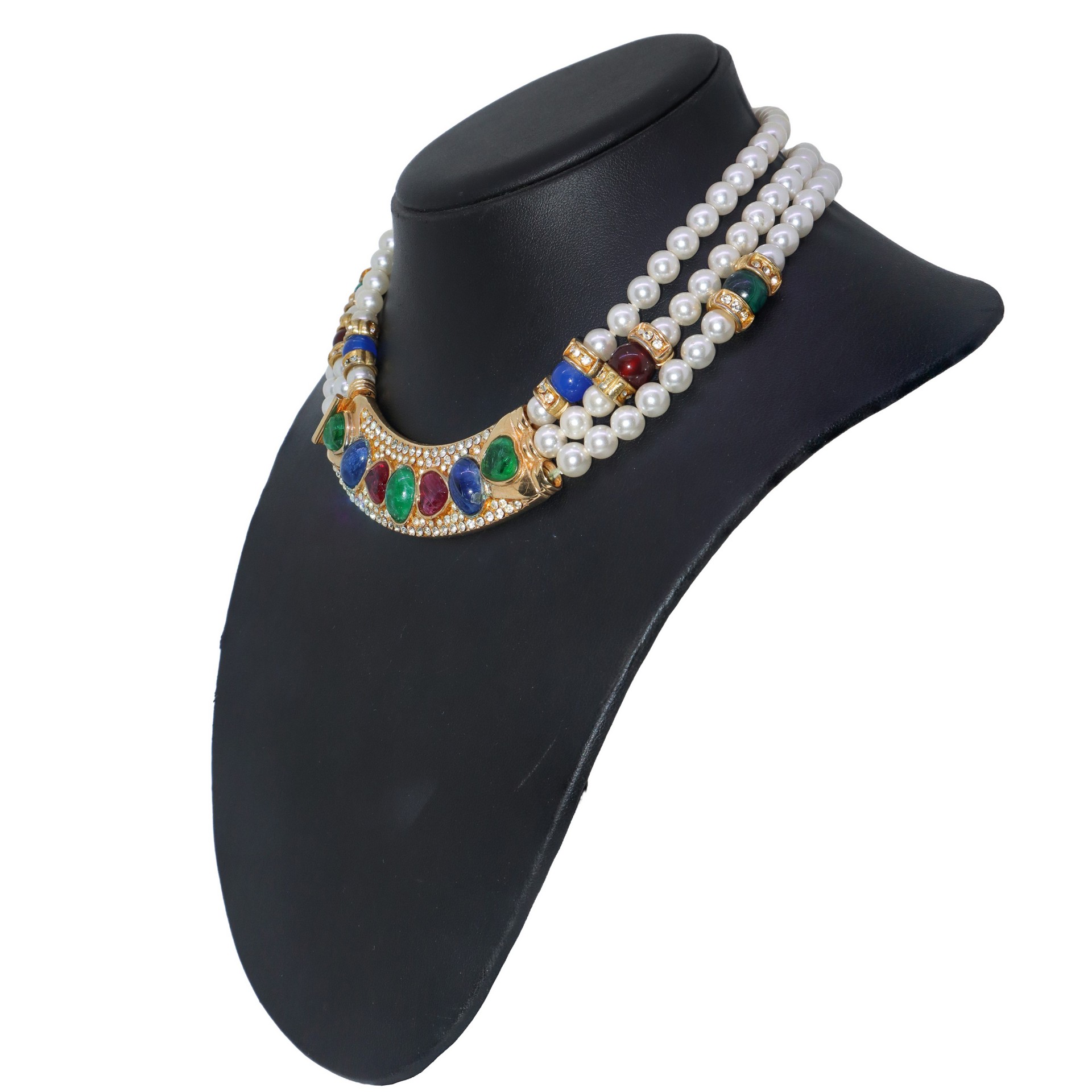 Bijoux Cascio - Collana con 3 fili di perle e centrale con pietre colorate e strass