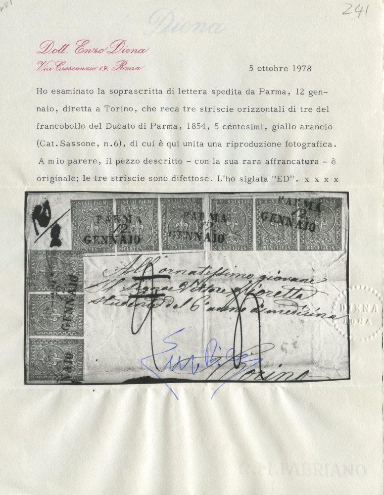 1854 - 5 cent. giallo arancio n.6, tre strisce di tre su un unico frontespizio di lettera spedita da parma il 12 gennaio per Torino. Insieme con alcuni difetti ma molto raro, probabilmente tra i massimi multipli di questo francobollosu documento. (B) (cert. En. Diena)