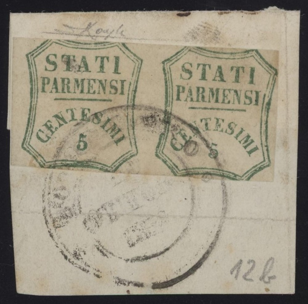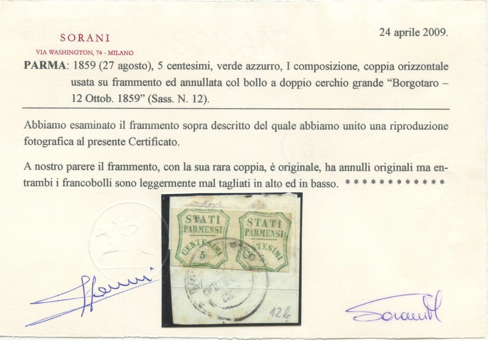 1859 - Coppia del 5 centesimi verde azzurro n.12 conservata su frammento annullato tramite il DC di Borgotaro (9pt.). La rara coppia è leggermente difettosa ed è accompagnata da due certificati. Cat. 25.250 . (B) (Cert. Raybaudi, Cert. Sorani)
