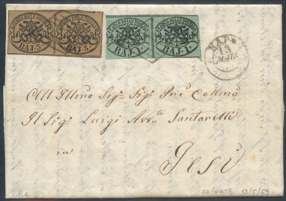 13.05.1859 - Lettera da Orte per Jesi affrancata per 8 baj. tramite una coppia del 3 baj. bruno grigiastro chiaro n.4a ed una coppia del 1 baj. verde grigiastro n.2. Sul retro della lettera lo SD di ORTE (4pt.) Combinazione non comune. (A-) (En. Diena)