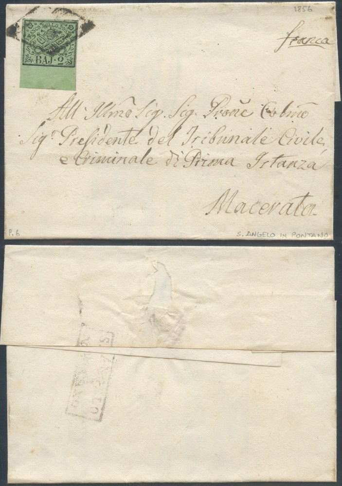 1859 - Busta spedita da S.Angelo in Pontano per Macerata affrancata tramite un 2 baj. verde oliva n.3 con ampio bordo di foglio in basso. Sul retro della busta l'annullo in cartella di S.Angelo in Pontano (6pt.) (LUX)