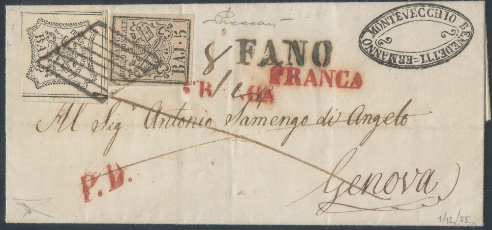 01.12.1855 - Lettera instradata da Montevecchio per Genova affrancata per 13 baj. tramite un 5 baj. rosa chiaro n.6 ed un 8 baj. bianco n.9. (A+) (Bottacchi, Vaccari)