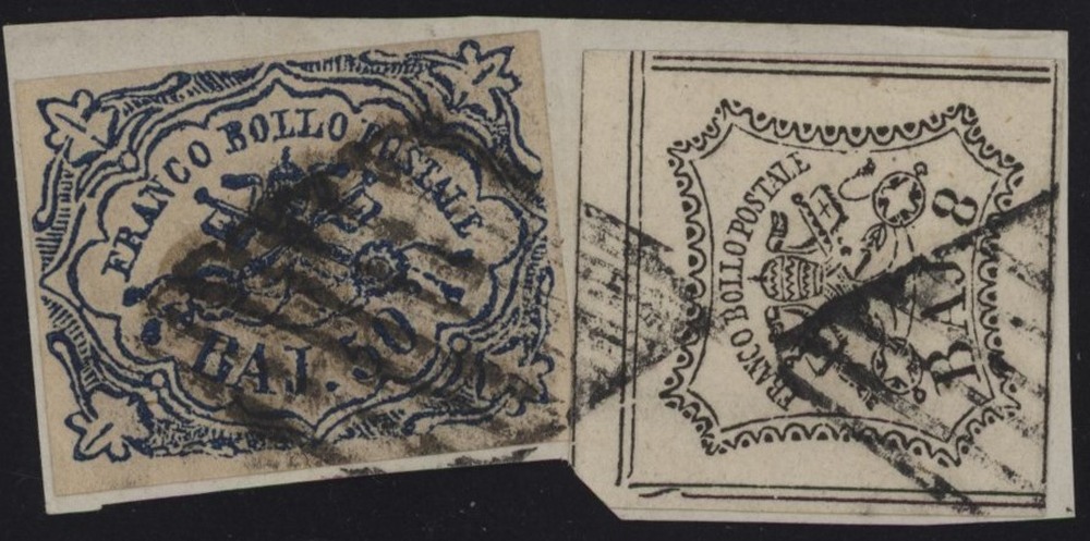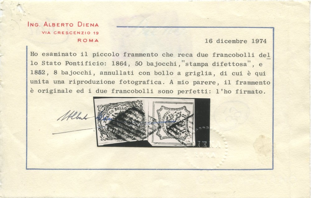 1864 - Splendido frammento affrancato per 58 baj. tramite un 50 baj. classificato e certificato da Alberto Diena come stampa difettosa n.12 e un 8 baj. bianco n.9 con interspazio di gruppo in alto. Insieme di grande pregio. Cat. 9.000++. (LUX) (Cert. Alberto Diena, Vaccari, Oliva)
