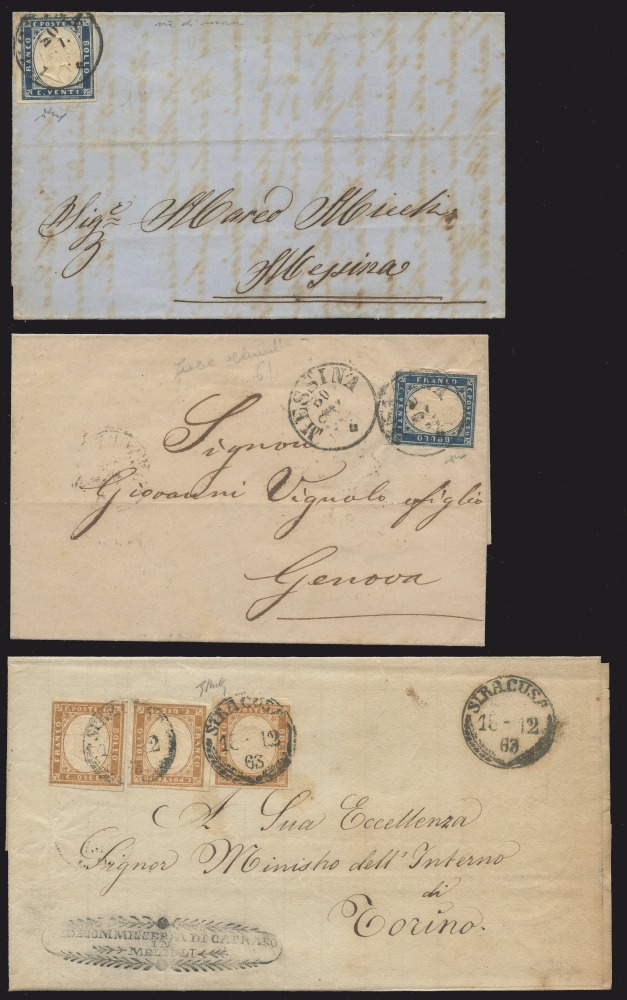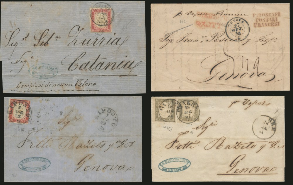 Straordinaria collezione incentrata sulle vie di mare con tratta Torino - Genova verso la Sicilia (e viceversa) e le tariffe e tassazioni relative ai diversi periodi. Notate lettere molto interessanti e affrancature assolutamente non comuni. Altissimo valore di catalogo, EX Collezione del Dott. Saverio Imperato.