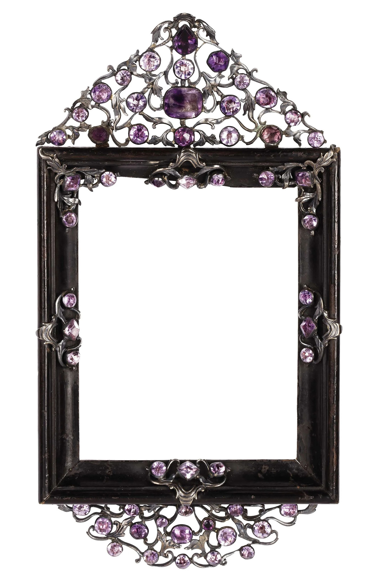 Cornice in legno ebanizzato profilo modanato con applicazioni in argento impreziosita da ametiste (n 55) a ornare la struttura della cornice Sec XVII