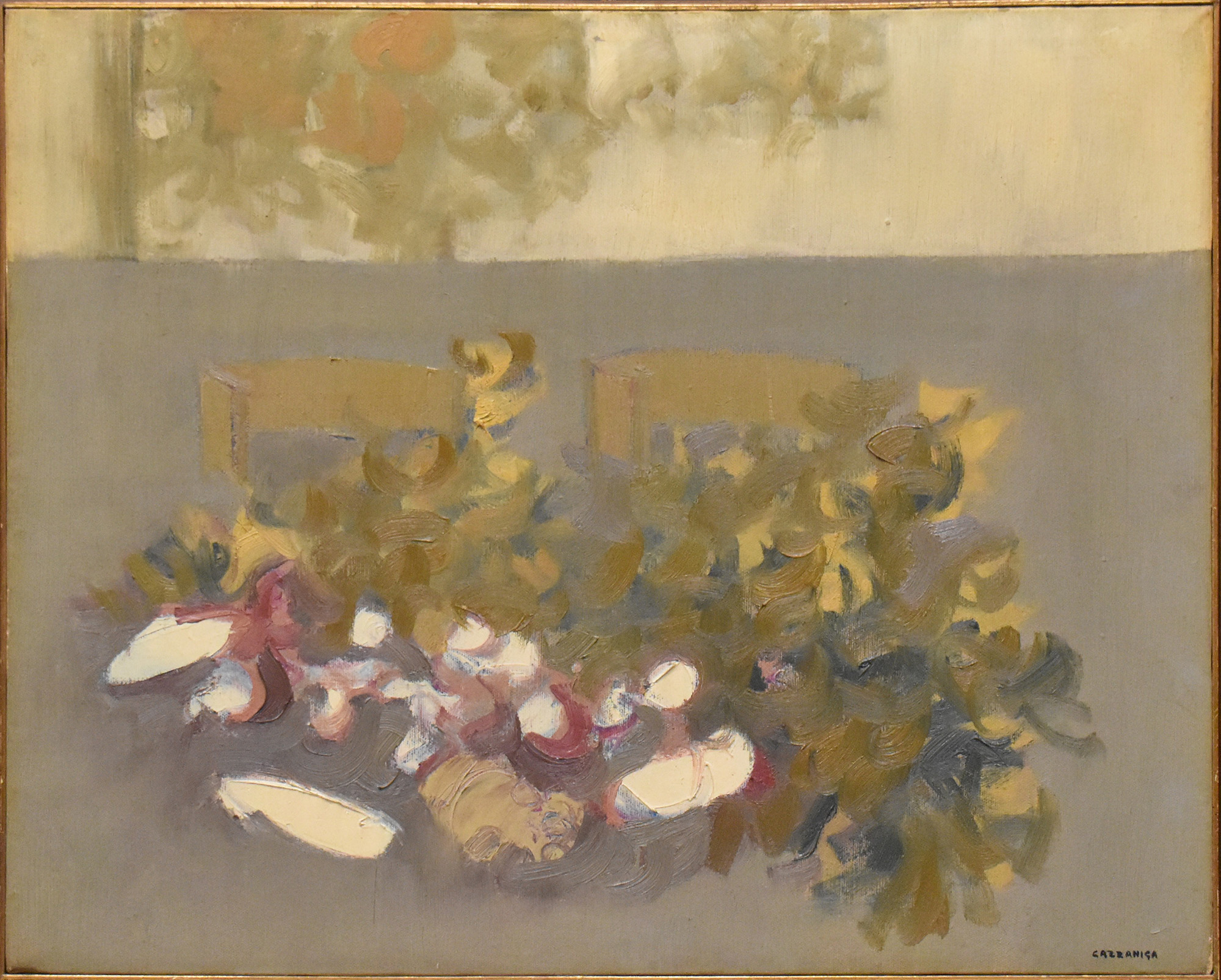 olio su tela firmato in basso a destra Cazzaniga. Sul retro etichette 'Galleria Annunciata''D4 Galleria d'arte' e timbri gallerie