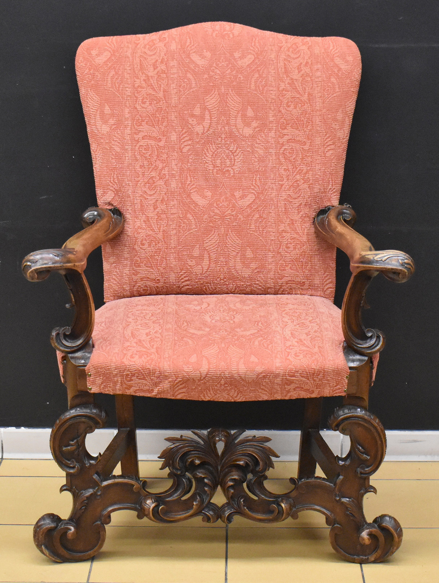 Precedente Lotto 0144 Successivo Casa d'Aste Martini - C.so Cavallotti 76, 18038 Sanremo ASTA DI ANTIQUARIATO, DIPINTI E ARTE ORIENTALE Sessione unica mercoledì 23 ottobre 2024 ore 15:00 (UTC +01:00) POLTRONA Poltrona in noce scolpito e tessuto sec XVIII