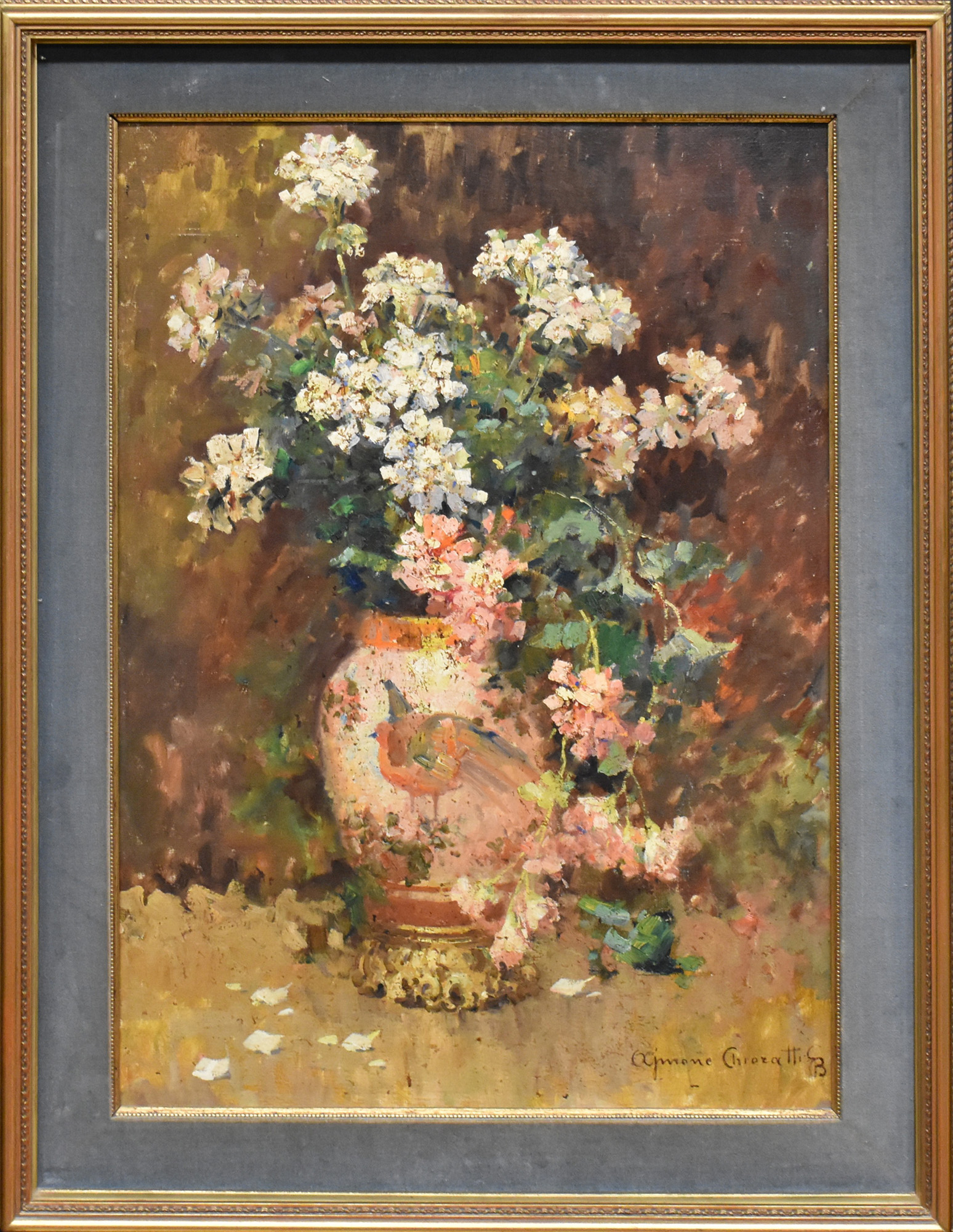 Jean Aimone Chioratti (1889-1951) 'Gerani' olio su cartone firmato in basso a destra .Sul retro etichetta Mostra d'arte italiana