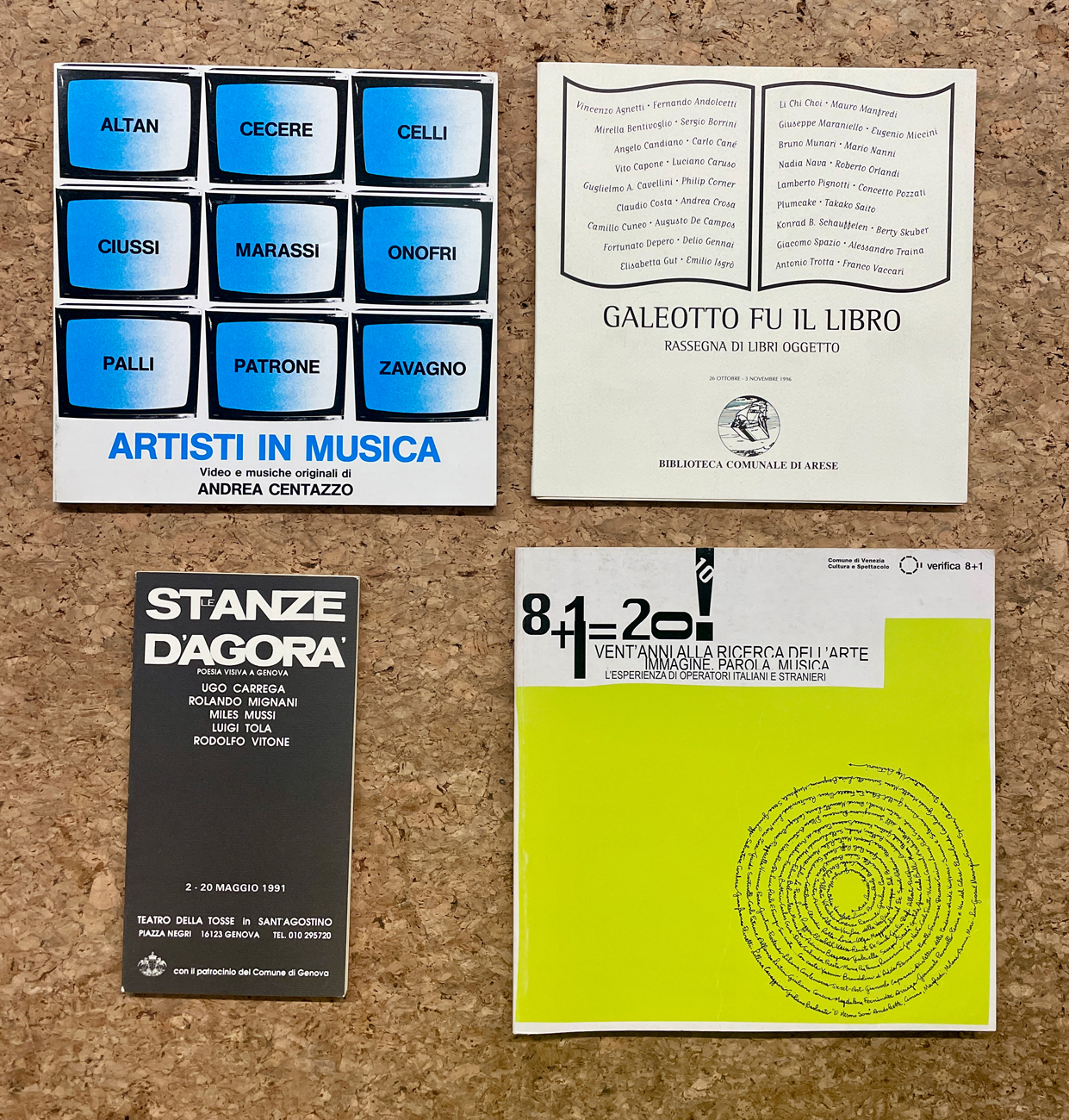 - Le stanze d'agorà. Poesia visiva a Genova, 1991 (esposizione presso Teatro della Tosse, Genova)