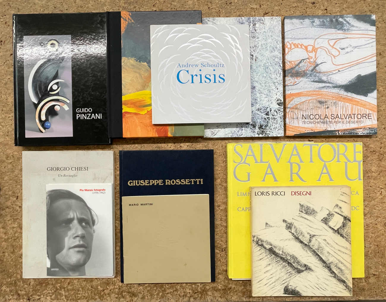Lotto unico di 11 cataloghi relativi ai seguenti artisti: Guido Pinzani, Sergio Piccoli, Giuseppe Rossetti, Francesco Pignatelli, Nicola Salvatore, Mario Martini, Andrew Schoultz, Loris Ricci, Pio Manzù, Giorgio Chiesi e Salvatore Garau