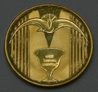 Verso: rappresentazione dello Spirito Santo in forma di colomba, nell’atto di discendere sulla Chiesa, resa nell’immagine del calice dell’azione liturgica (Artista Elio Marchegiani).