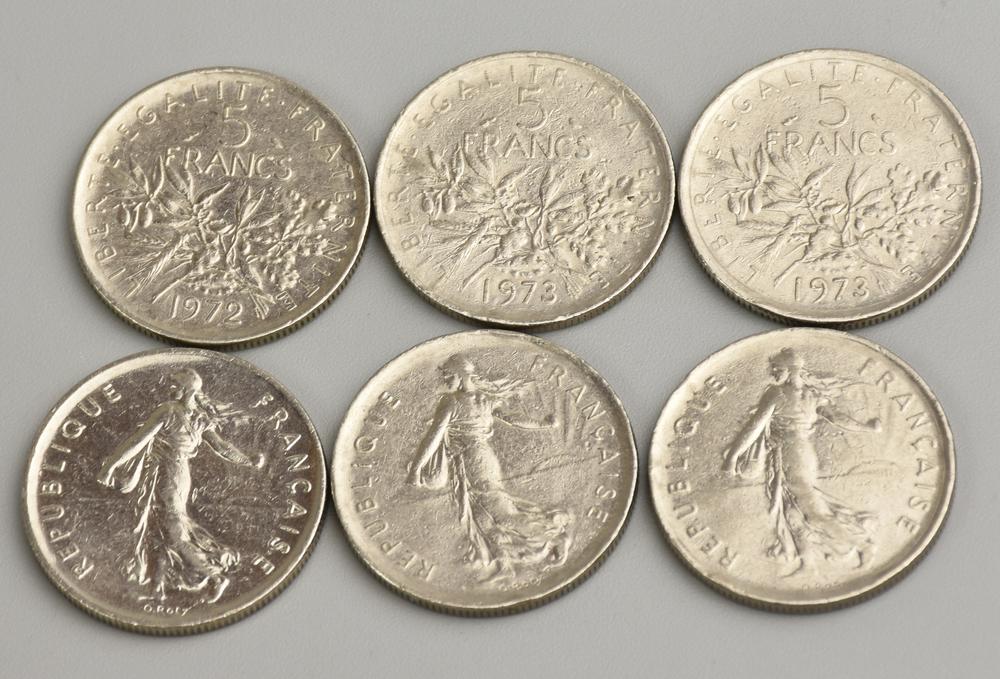 LOTTO DI FRANCHI FRANCESI composto da 6 monete da 5 franchi vari anni di...