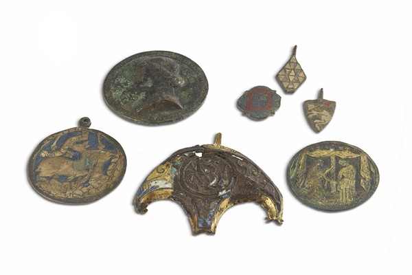 Manufacture of Limoges, 13th-14th century. Lot of six metal plates with traces of polychrome enamel joined to a bronze medal by Matteo de' Pasti with relief by Sigismondo Pandolfo Malatesta and Malatesta fortress. Rimini, mid-15th century (defects and losses)