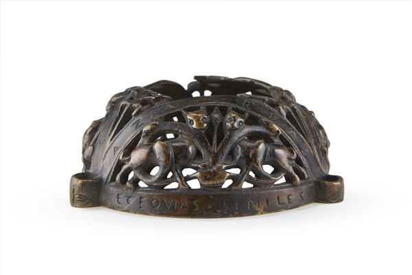 Fonditore del secolo XIII. Coperchio di incensiere in bronzo traforato e decorato ad animali e volute fogliate con iscrizioni (cm 10x5)