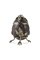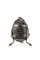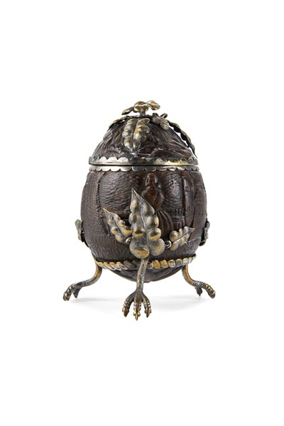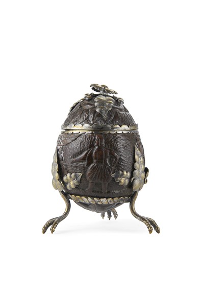 Arte coloniale del secolo XIX. Coppa con coperchio ricavata da un seme scolpito a figure popolari entro paesaggi, ghiere, prese e piedini in metallo argentato a elementi vegetali e zampe di rapace (h. cm 13) (difetti)
