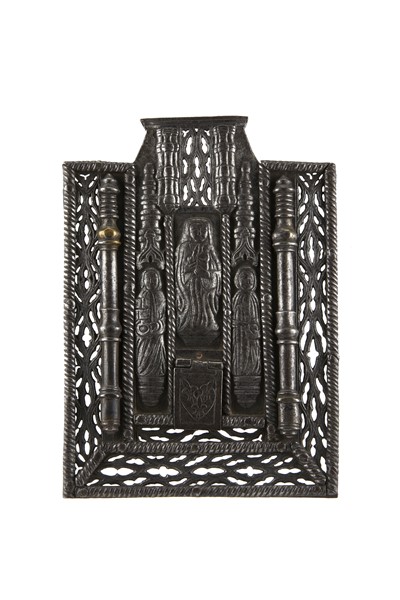 Serramento da mobile in ferro decorato e traforato a volute e santi. Copriserratura cesellata con stemma nobiliare. Germania, secolo XV (cm 21x15)