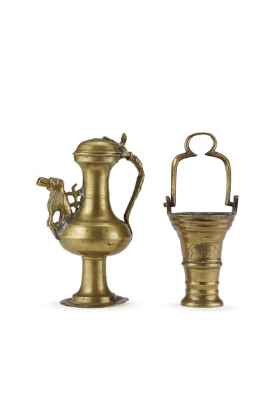 Arte del secolo XV-XVI. Secchiello per acqua santa con manico, data 1535 incisa, unito ad un acquamanile con beccuccio zoomorfo in bronzo (h. max cm 21) (difetti e restauri)
